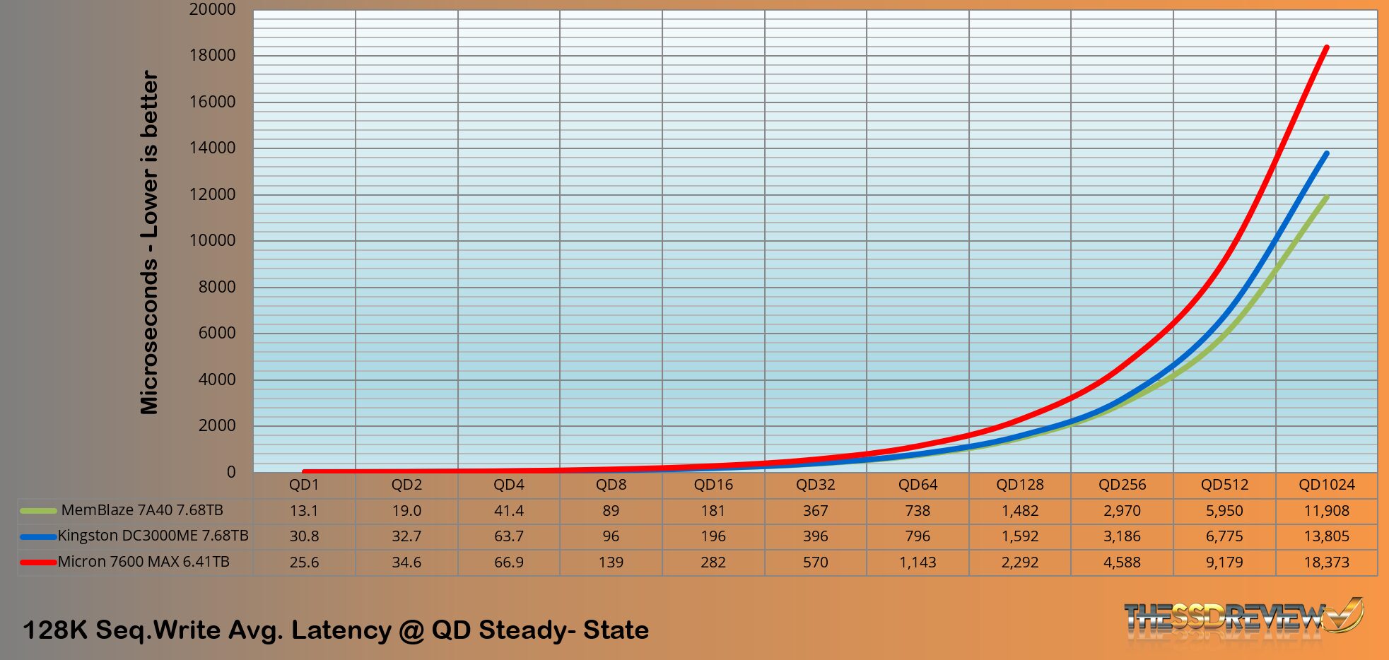 Listed specifications for the Micron 7600 MAX Gen5 6.4TB U2 SSD are 7GB/s write throughput and our performance improves upon that slightly with a high of 7.3GB/s.
