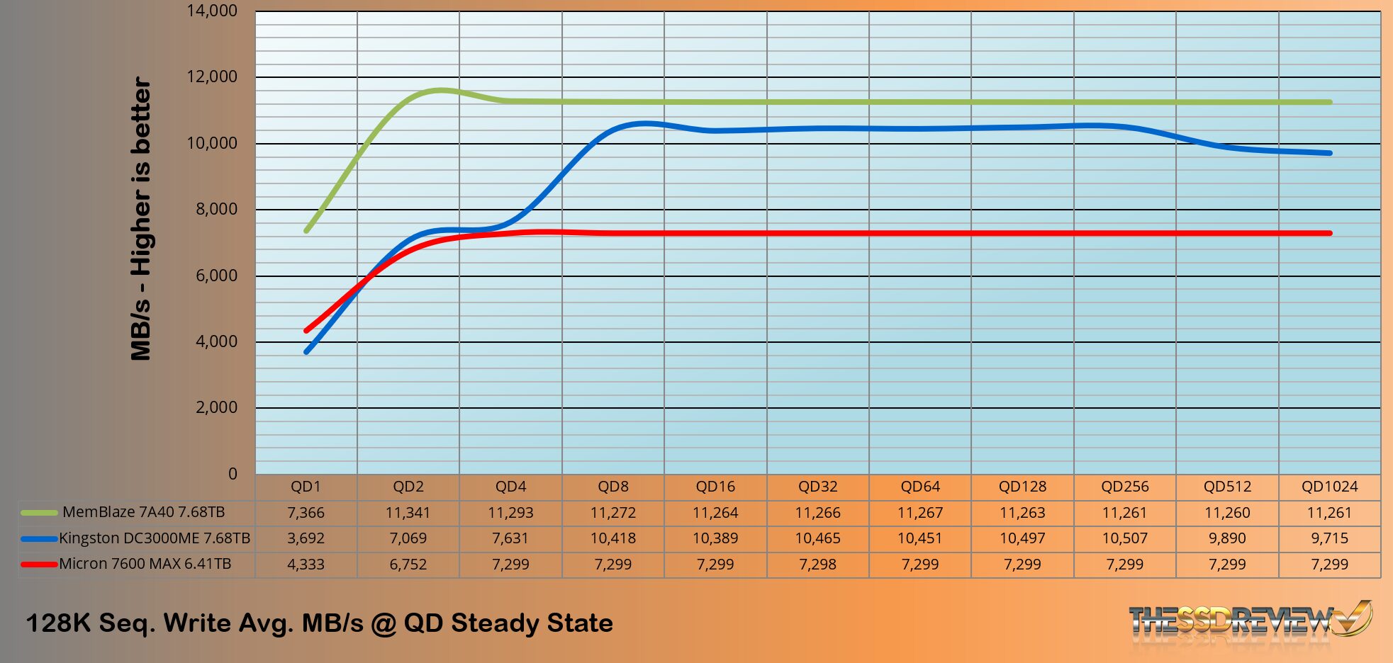 We precondition our enterprise SSDs using 100% sequential 128K writes at QD256 using one thread for two drive fills. Performance data is recorded every second. We track this data to monitor the enterprise SSDs transition to steady-state and to verify that steady-state conditions are achieved before initiating queue depth testing. Steady-state is established after a full drive fill. At this point, the average steady-state 128K sequential write performance is approximately 7.3GB/s.
