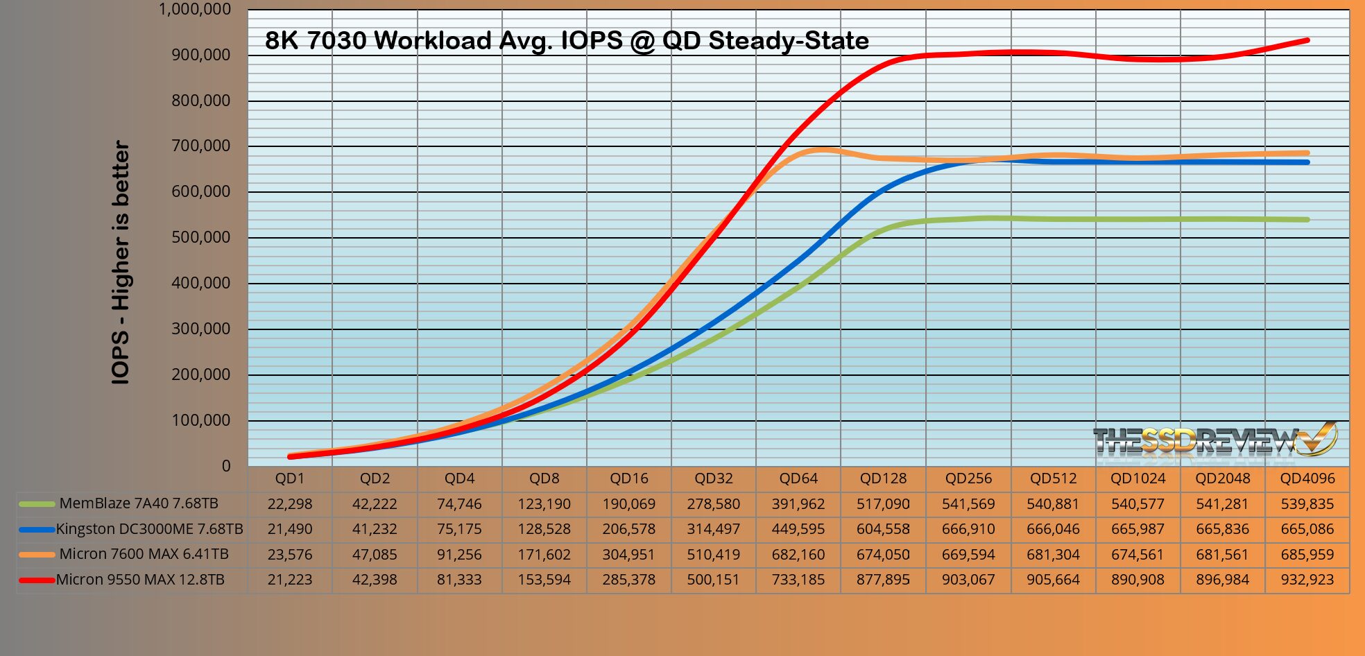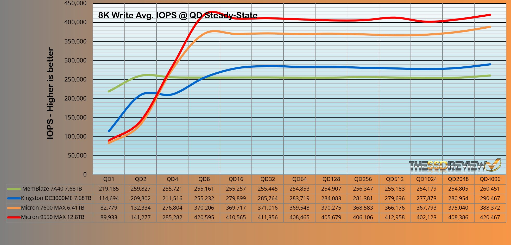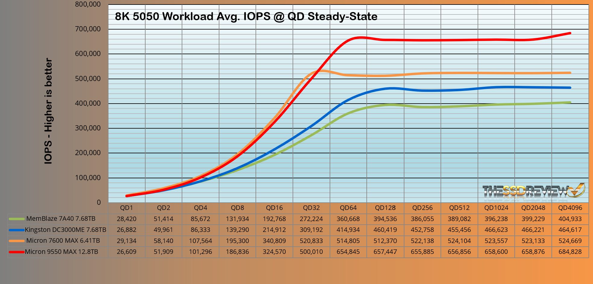 The Micron 9550 MAX 3-DWPD SSD surpassed the performance of the group as would be expected from this SSD. It maintained an average of 656K IOPS throughout QD 128-4096, and once again is the top result to date.
