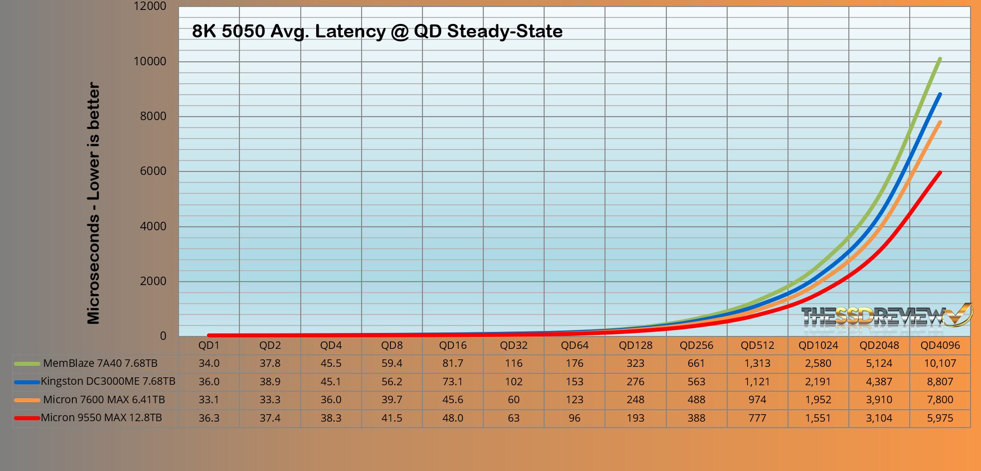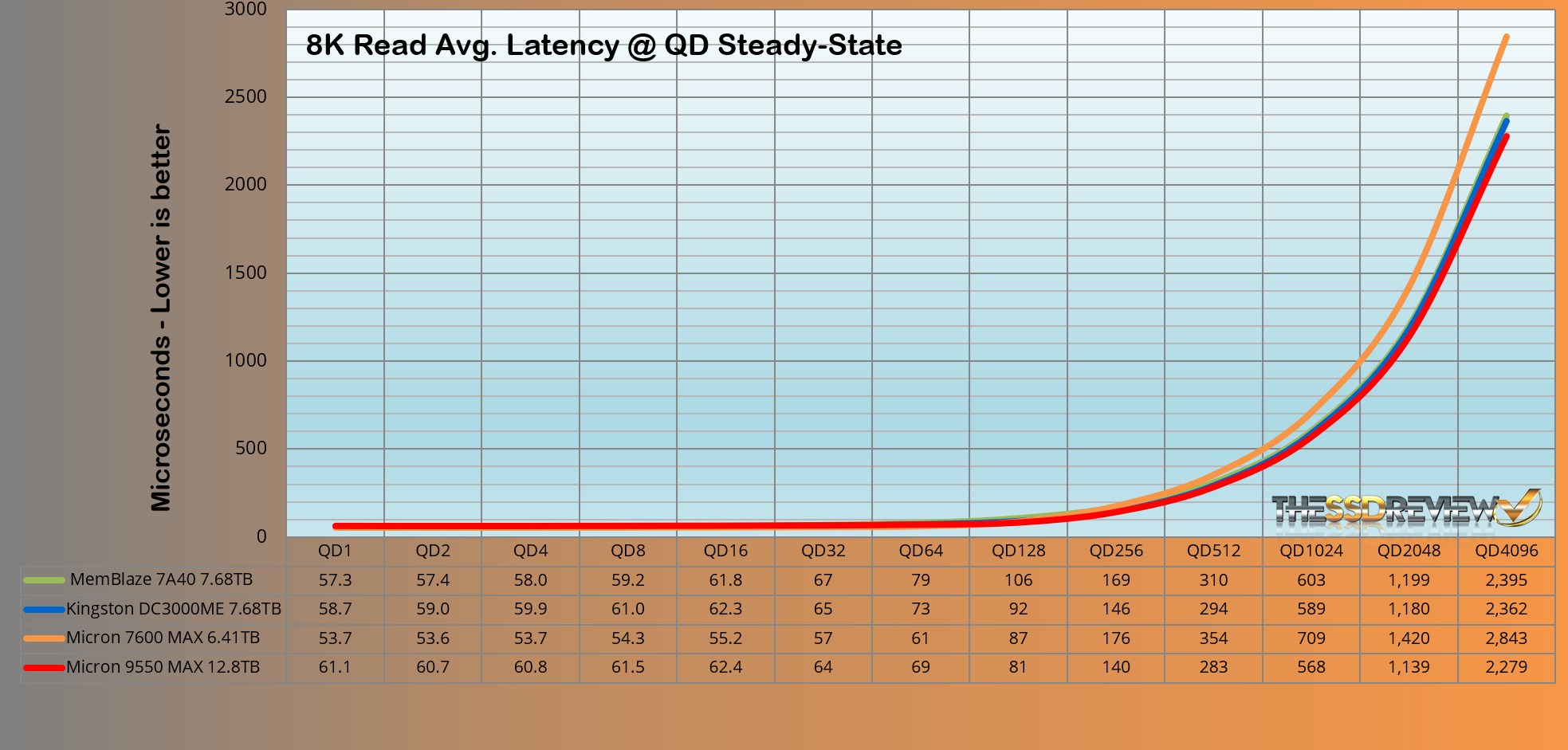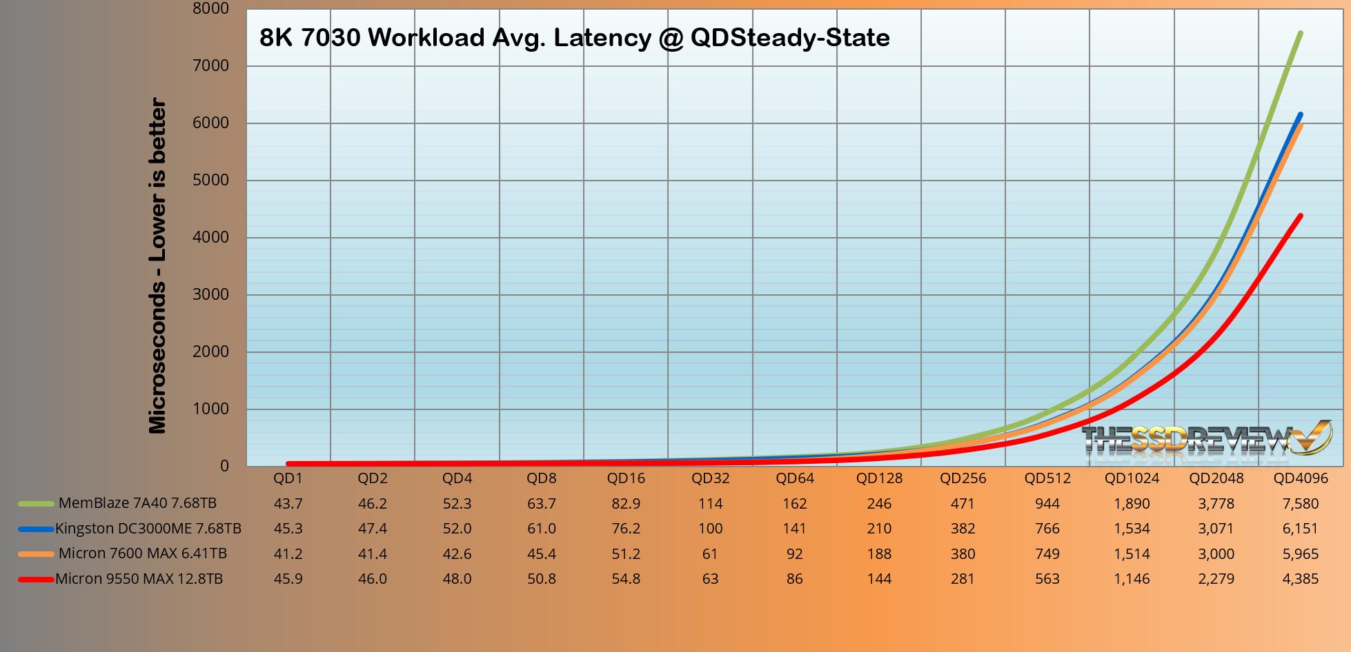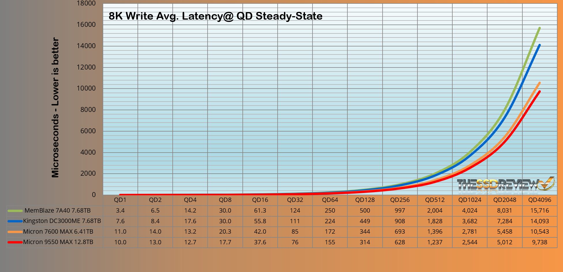 The Micron 9550 MAX 3-DWPD SSD surpassed the performance of the group as would be expected from this SSD. It maintained an average of 656K IOPS throughout QD 128-4096, and once again is the top result to date.