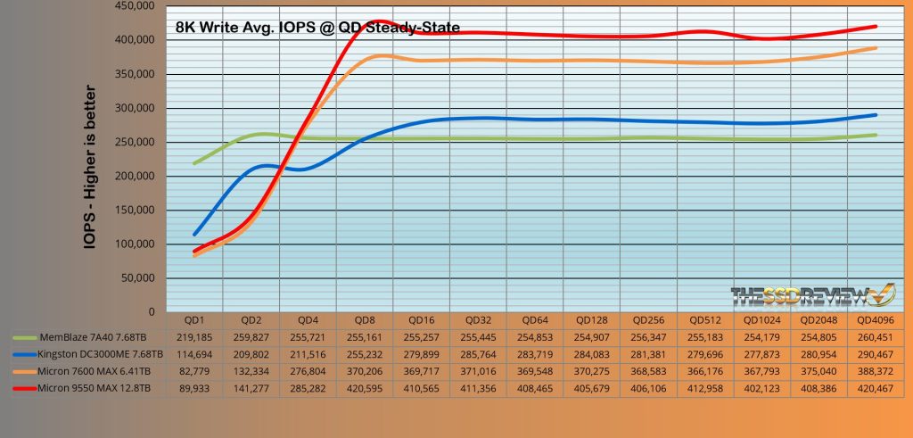 The full performance average of the Micron 9550 in 8K random write is 408K IOPS which we expected to be half of that of 4k as it is moving twice the amount of data, but this performance curve is very impressive. It levels off at QD16 which is a bit later than that Memblaze Pblaze 7, but it has the tradeoff of maintaining much higher IOPS from QD8…150K on average in fact.
