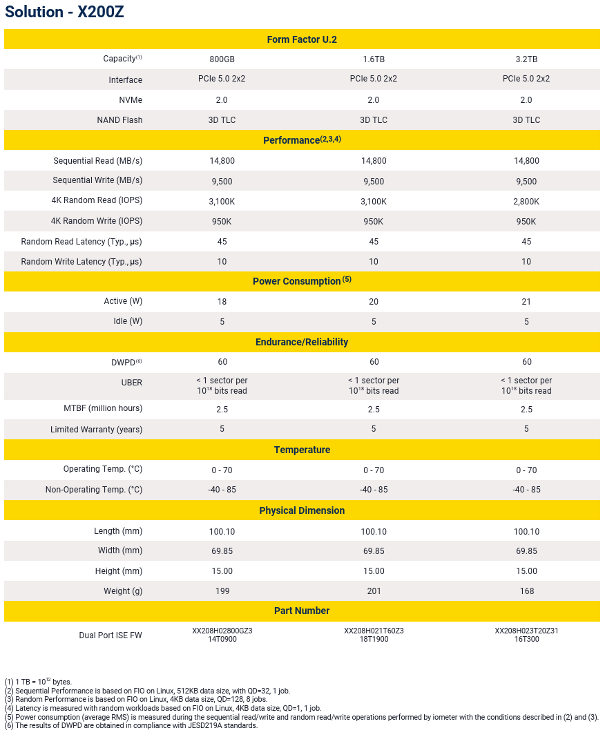 The X200Z delivers impressive performance, offering up to 14.8 GB/s sequential read and 9.5 GB/s sequential write speeds, with up to 3.1 million read IOPS and 950K random write IOPS. Its standout feature is its industry-leading endurance rating of 60 drive writes per day (DWPD), all while maintaining active power consumption below 20W. Backed by a 5-year warranty, the X200Z sets a high bar for enterprise-grade SSDs. For the full list of specifications, see here: