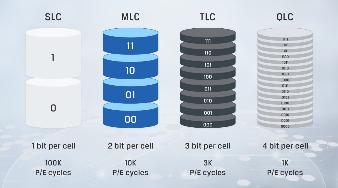 SLC stands for Single-Level Cell. Think of it like a one-story house with a single occupant… lots of space, no bumping into things. Technically, it is only one bit but that bit reflects two possible states: high or low voltage, on or off, programmed or erased. Fast, efficient, reliable. Then came MLC (Multi-Level Cell), which crammed two people into that same house.. or four states in a cell.