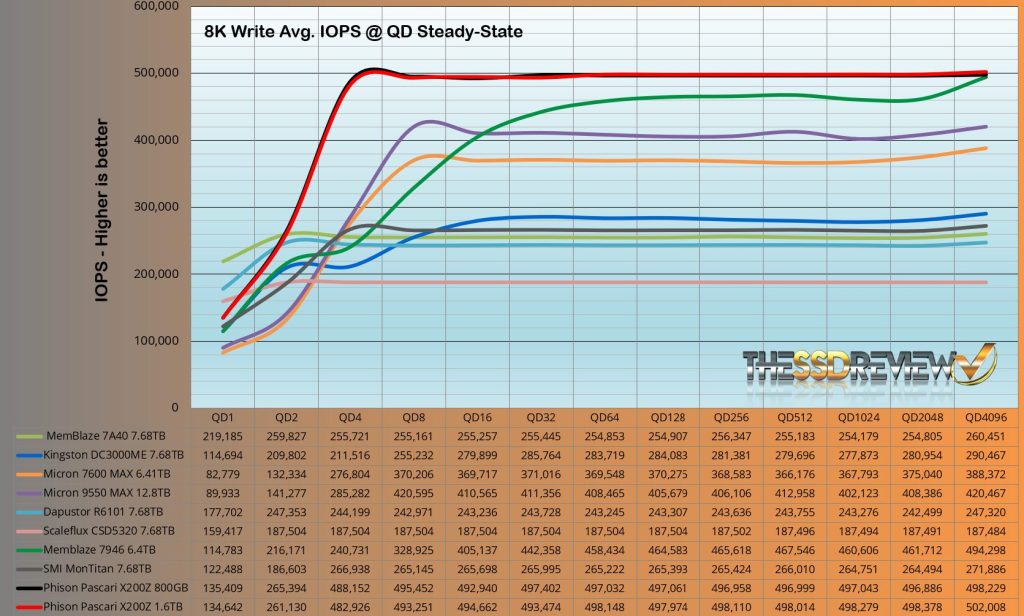 The performance average of both capacities of the X200Z is 497K IOPS in 8K random write which is one of the top, actually two of the top returns to date.