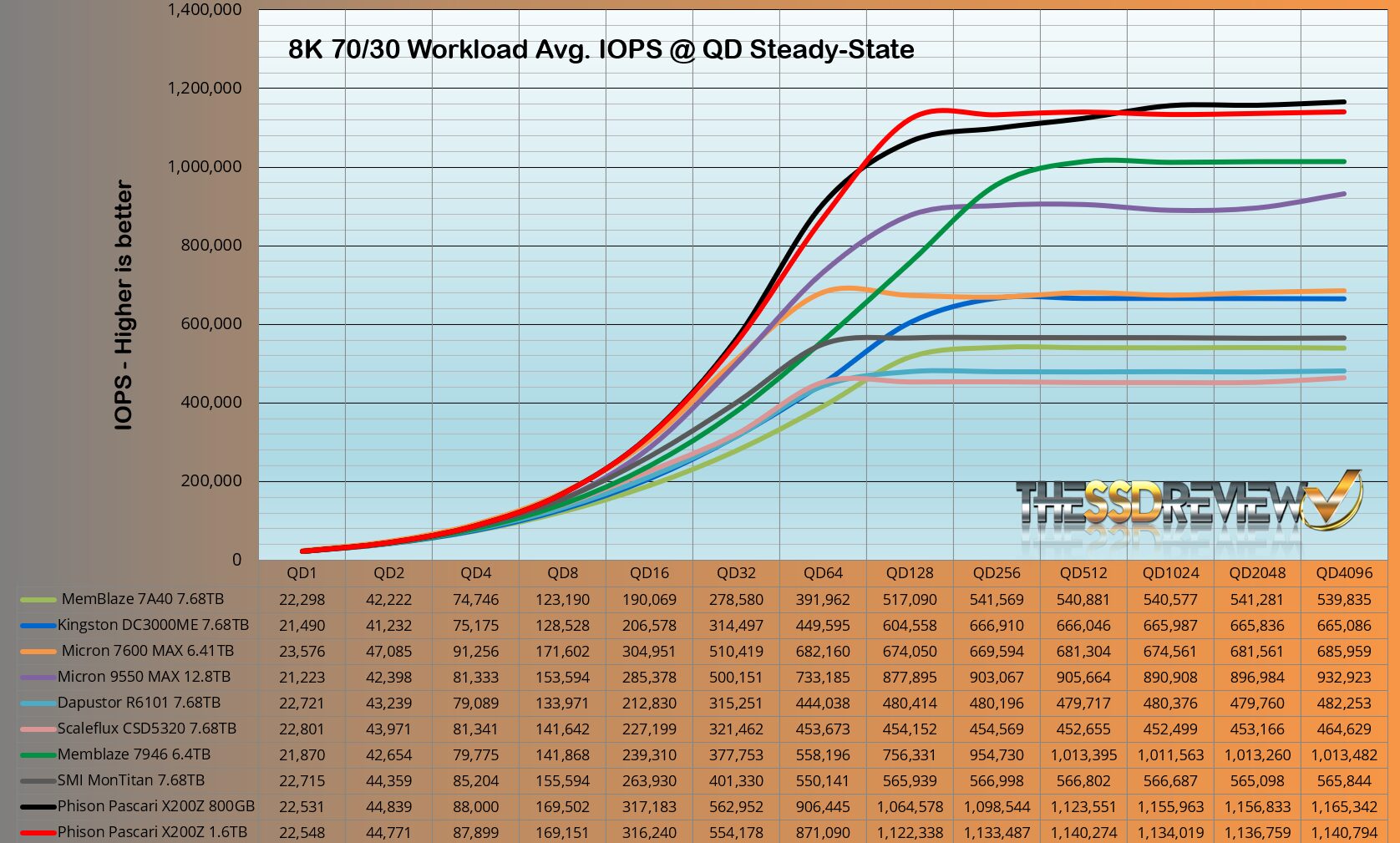 8K 70/30 is representative of a typical database workload and 1100K IOPS is very impressive, and again, one of the top results to date.