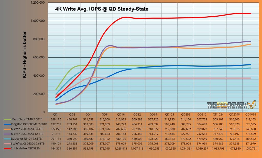 The listed spec for low 4K random write IOPS is 430K while we received 375K in regular mode. When tested with 2:1 compression, the Scaleflux CSD 5320 pulled off unheard of results of 1040K average write IOPS, almost 300MB/s higher than the next best Micron 9550. What is most impressive here is the fact that its performance continued to climb with no drop whatsoever.