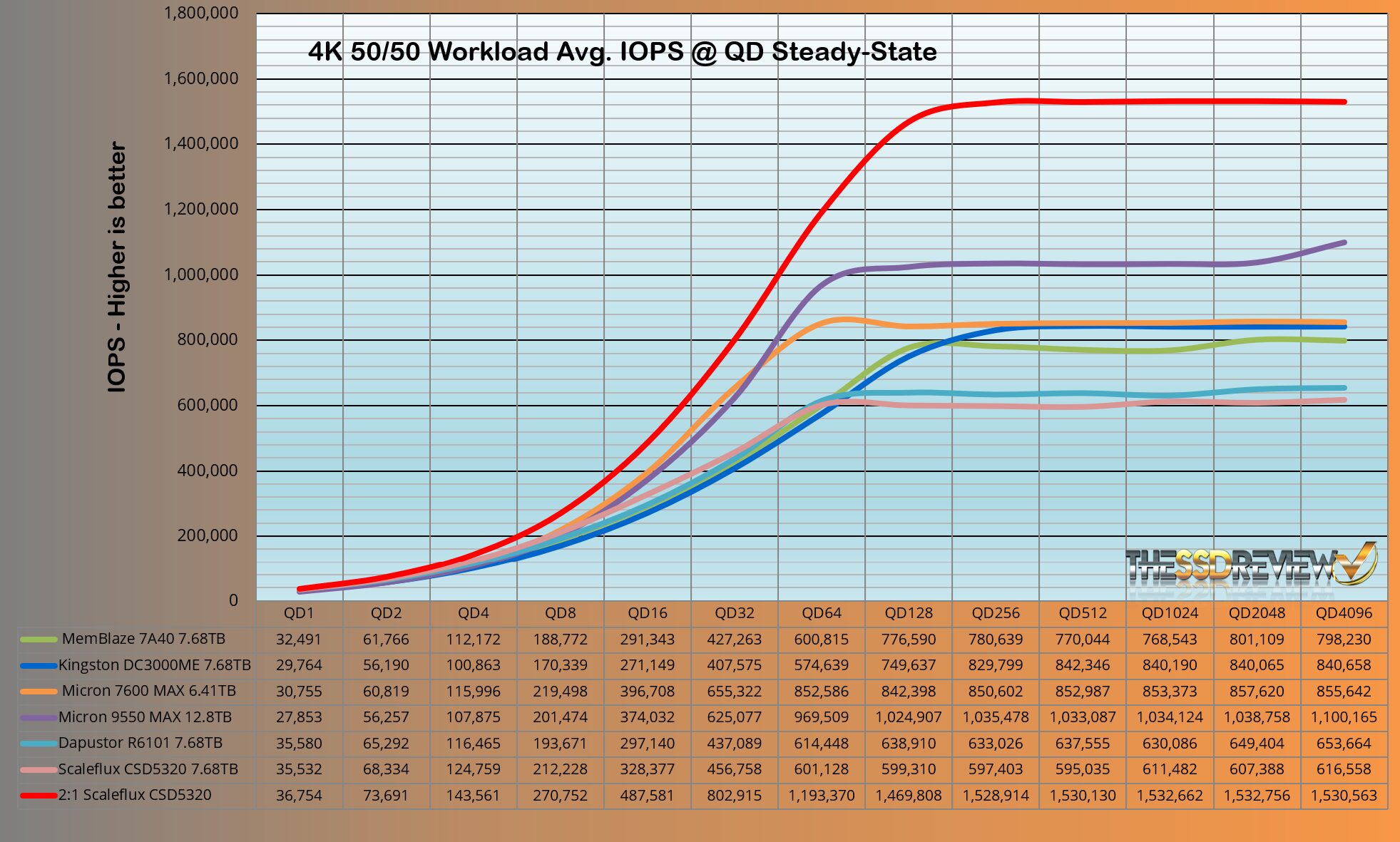 The CSD5320 pulled off an average performance result of 1530K IOPS through QD256-QD4096 with 2:1 compression, while it settled in less than half of that at 605K IOPS in normal mode.
