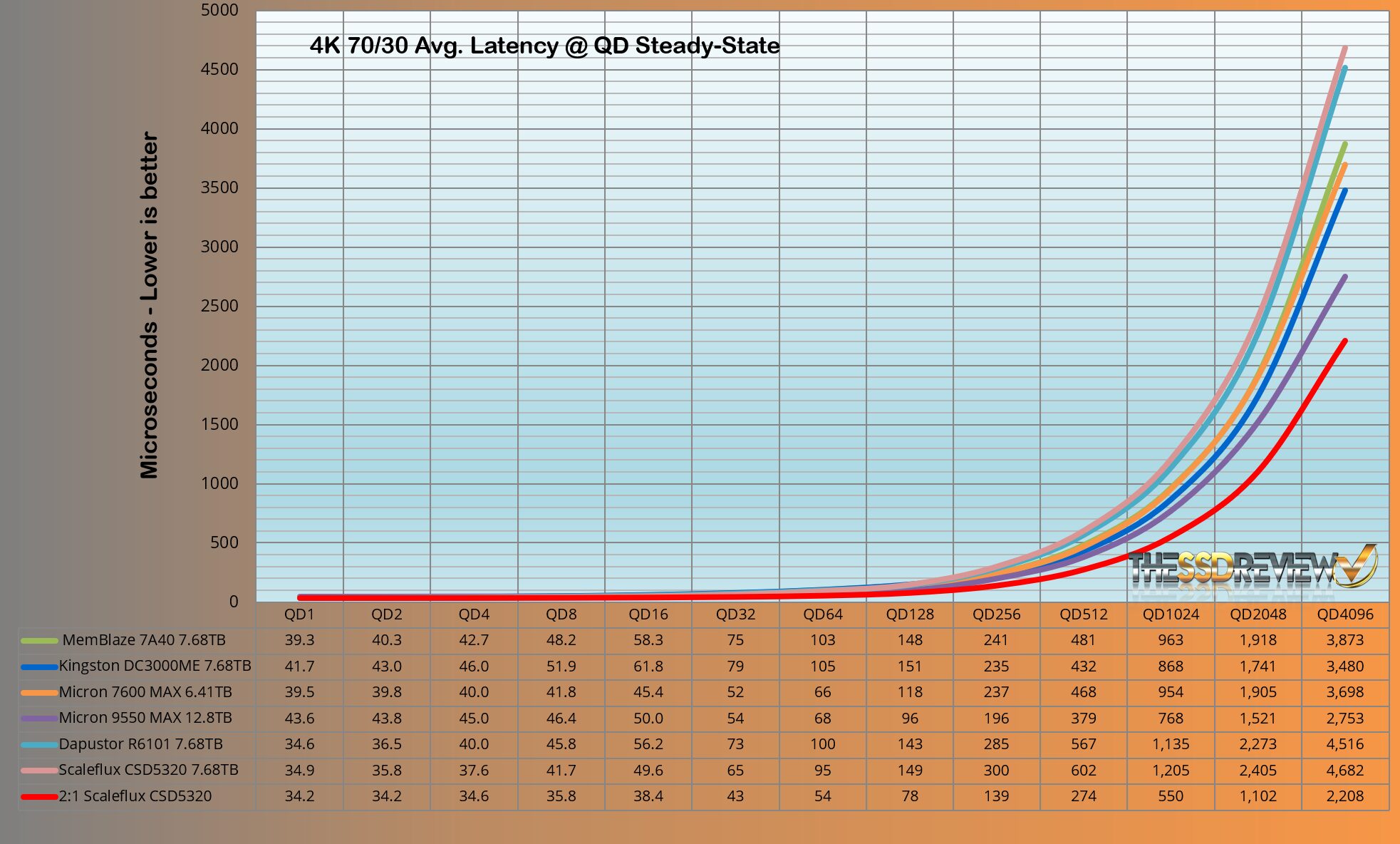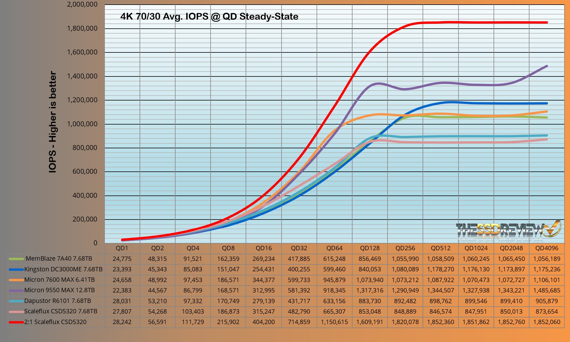 The CSD5320 realized a performance result average of 1851K in our 4K 70/30 profile which was an absolutely massive performance jump over all others. While not using 2:1 compression, this SSD averaged 848K IOPS which is less than half of that.