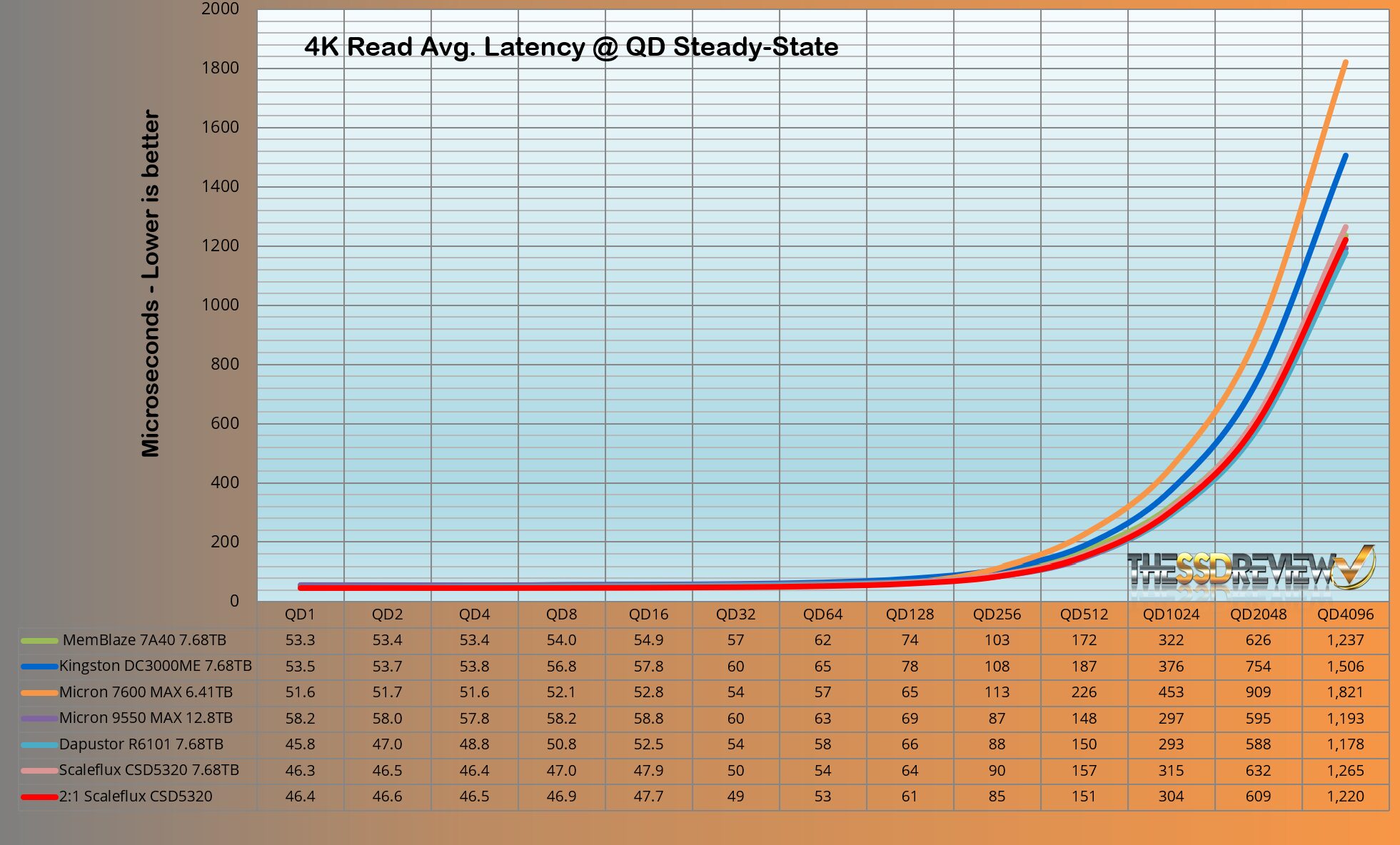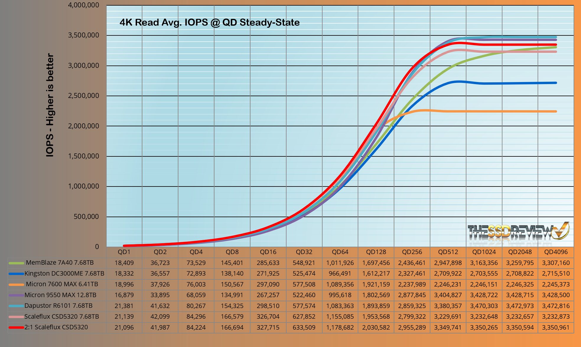 The listed spec for the Scaleflux CSD5320 Gen5 SSD is 3400K IOPS for sustained random read 4K IOPS during steady-state operation and our testing hit 3350K IOPS in 2:1 compression and 3232K IOPS with 1:1 compression..
