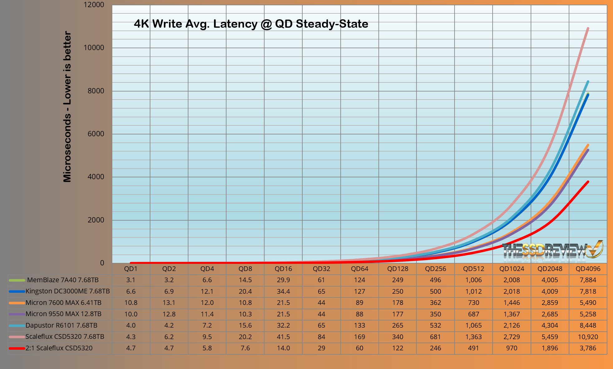 The listed spec for low 4K random write IOPS is 430K while we received 375K in regular mode. When tested with 2:1 compression, the Scaleflux CSD 5320 pulled off unheard of results of 1040K average write IOPS, almost 300MB/s higher than the next best Micron 9550. What is most impressive here is the fact that its performance continued to climb with no drop whatsoever.