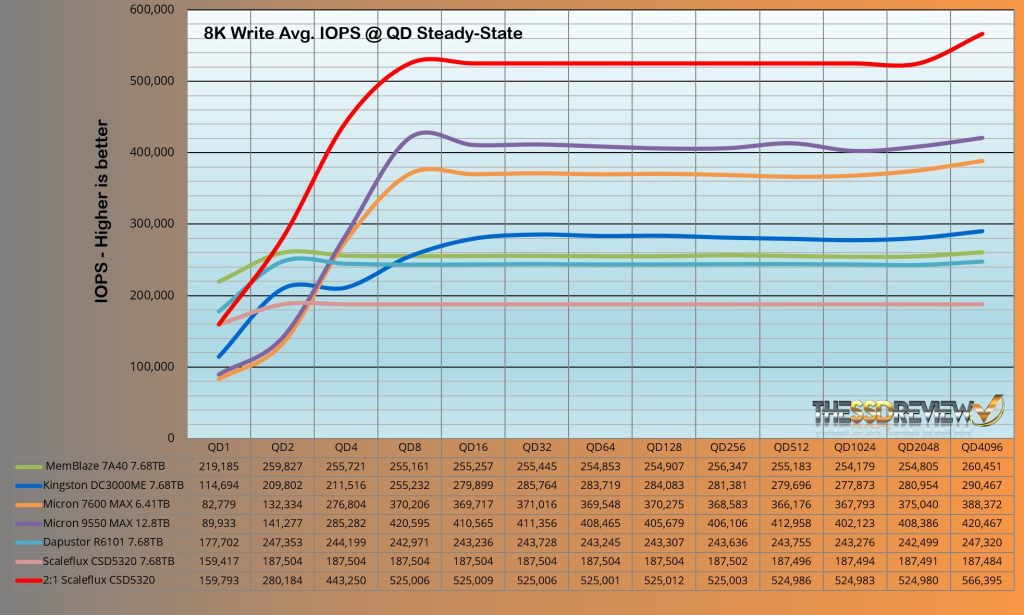 The ScaleFlux CSD5320 8K read performance of 1681K IOPS with 2:1 compression is impressive and this is reduced to 1448K IOPS otherwise.