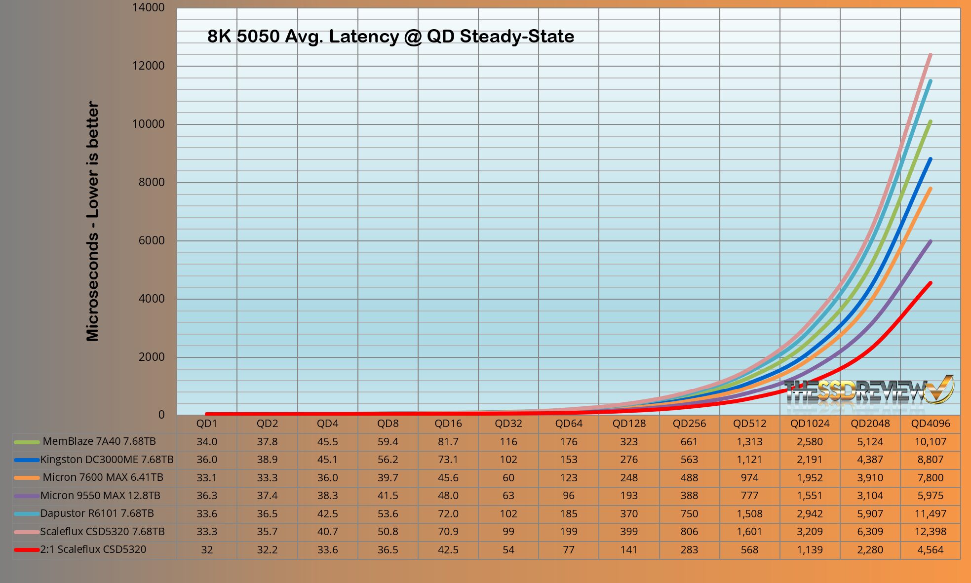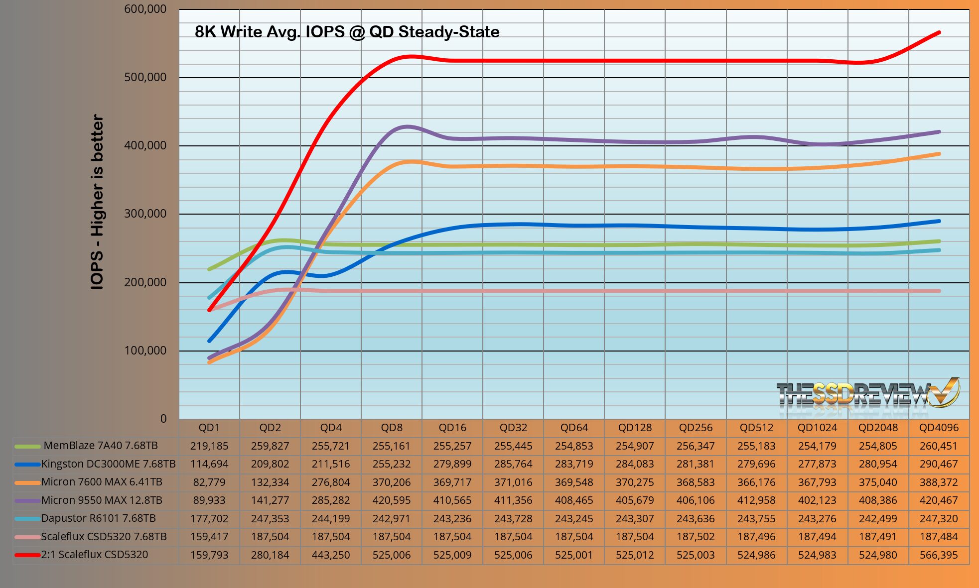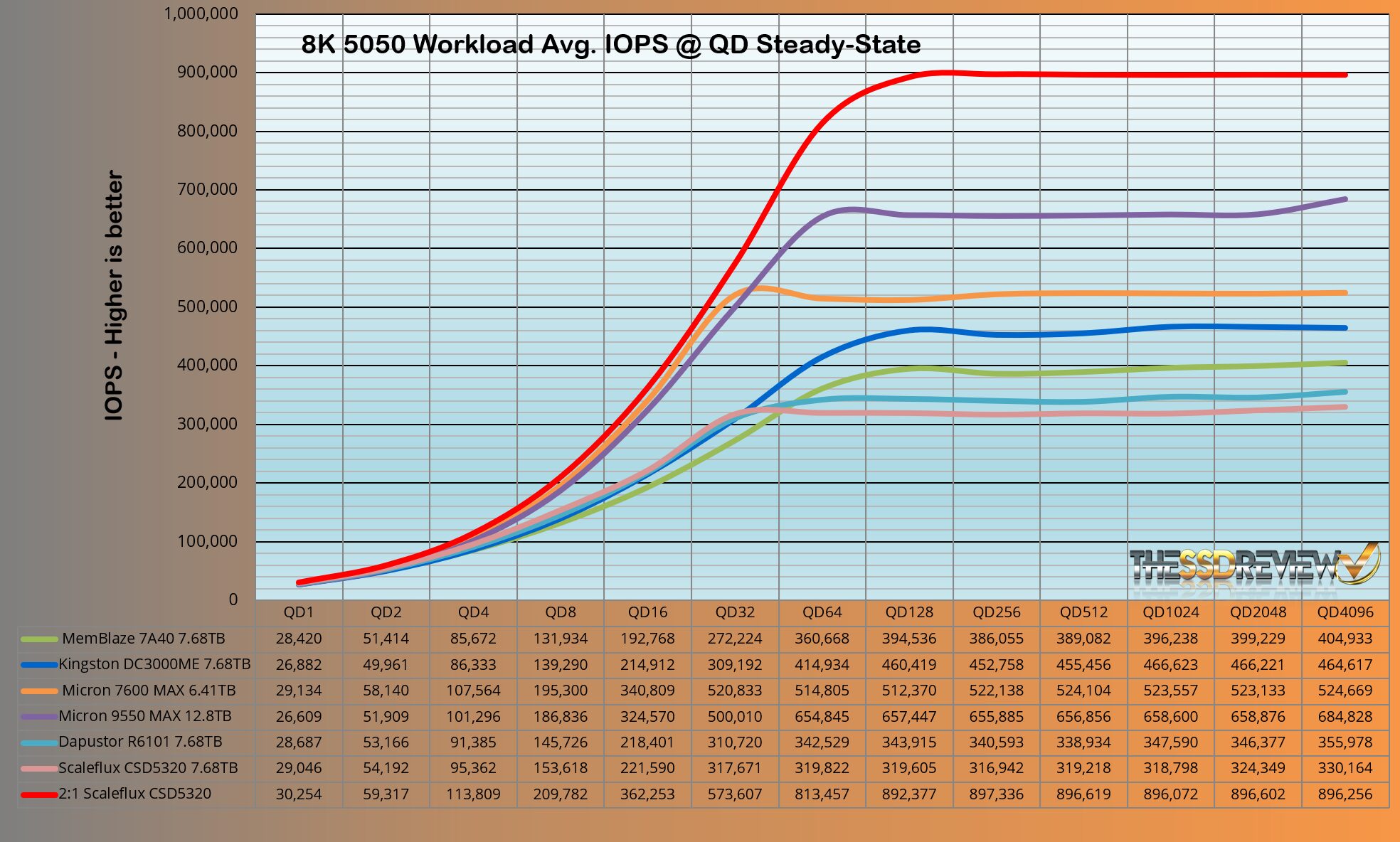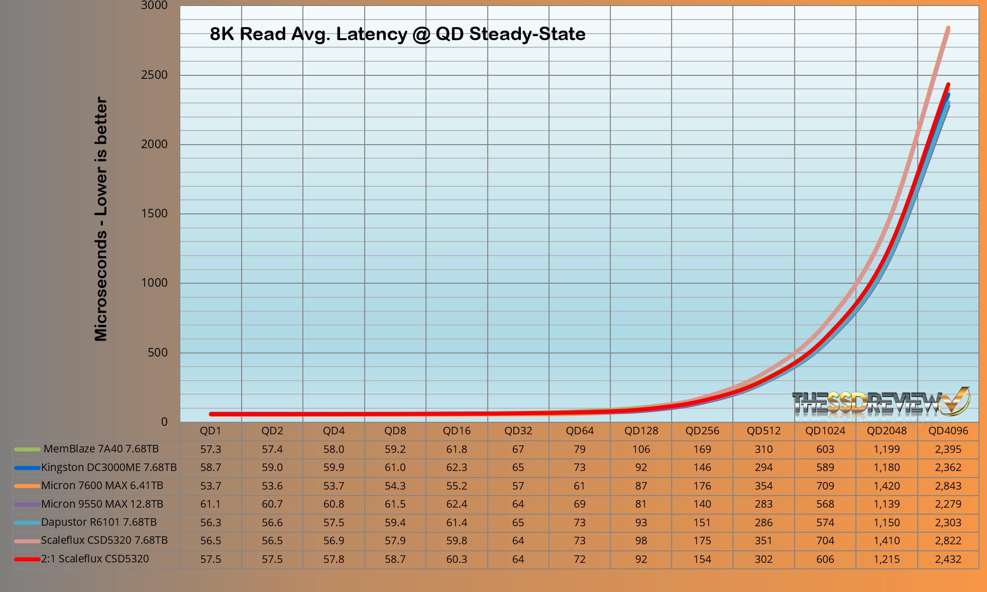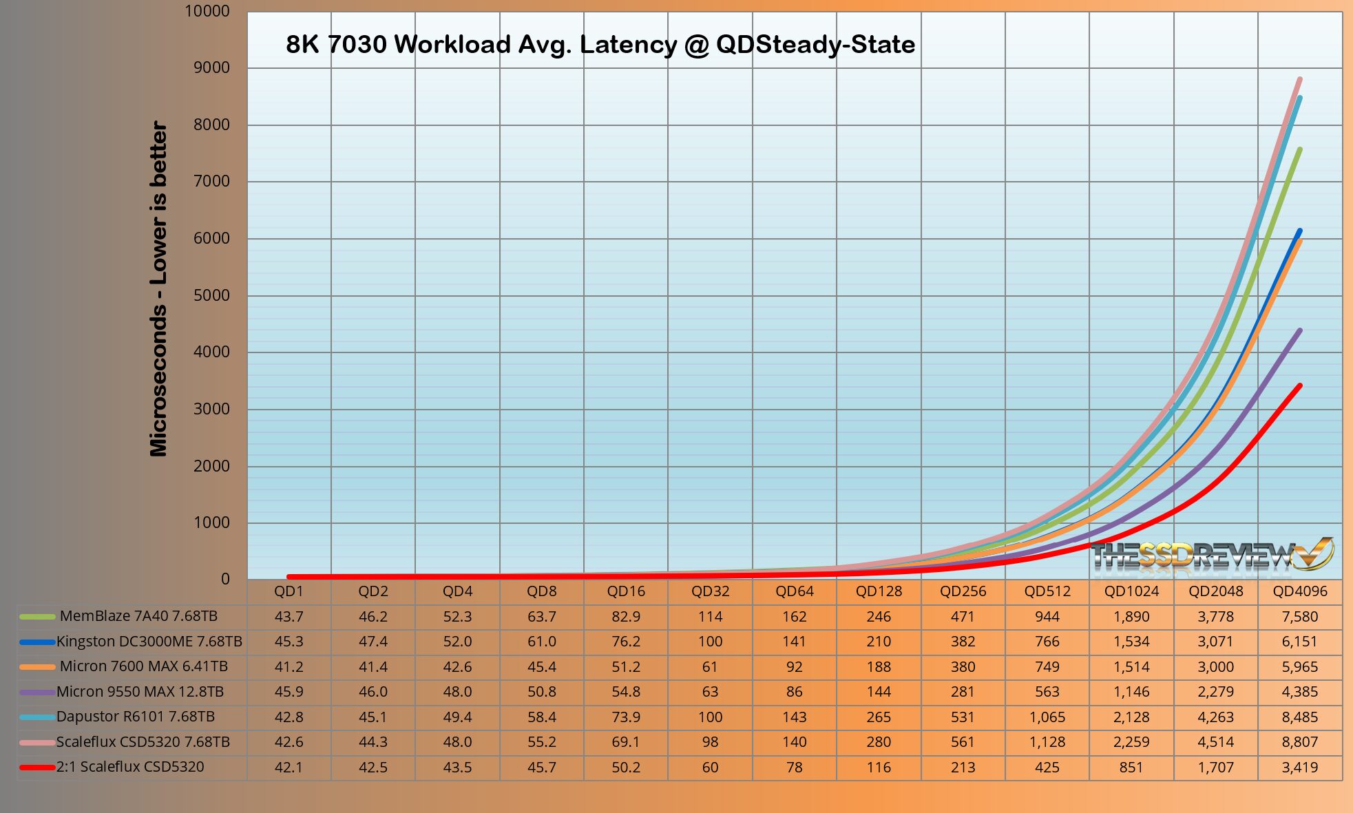 The ScaleFlux CSD5320 maintained an average of 319K IOPS throughout QD 64-4096 which jumped to the top position once again at 896K IOPS. No other SSD to date even comes close to this.