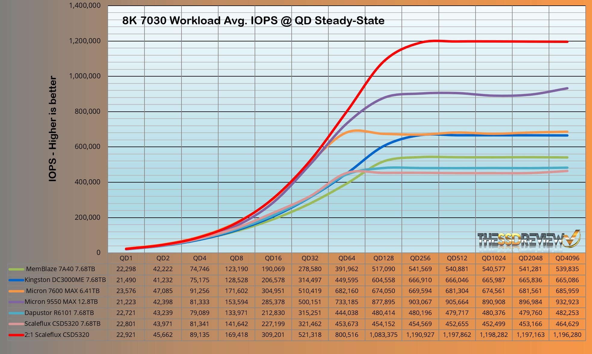 8K 70/30 is representative of a typical database workload and, where we once thought the Micron 9550 had a point to prove with its speed, the CSD5320 has done much the same by topping that Micron 9550 result significantly. Without 2:1 compression, the CSD5320 returned an average 452K IOPS, whereas with 2:1 compression activated, it jumped to 1196K IOPS leaving the rest behind.