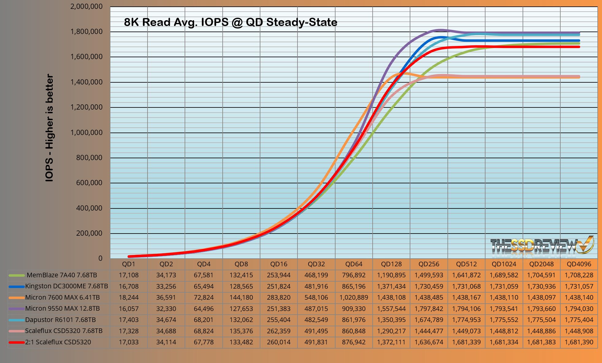 The ScaleFlux CSD5320 8K read performance of 1681K IOPS with 2:1 compression is impressive and this is reduced to 1448K IOPS otherwise.