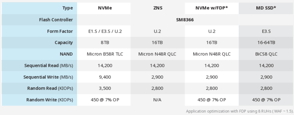 The MonTitan feature set includes NVMe 2.0, OCP 2.5, Namespace, Advanced Telemetry, Latency Monitoring, E2E (end-to-end) data protection, secure boot, MPF and SR-IOV (Single Root Input/Output Virtualization), enterprise security with AES 256-bit encryption, flexible data placement and multi-dimensional AI storage. The SMI MonTitan also has ‘Performashape’ which is a multi-stage shaping algorithm to optimize SSD performance on a per user-defined QoS set bases. This is configured in firmware. Combined with using true HW isolation technology, the SM8366 ensures maximum bandwidth performance while maximizing user-defined individual performance elements (QOS, Latency, RR/RW, power).