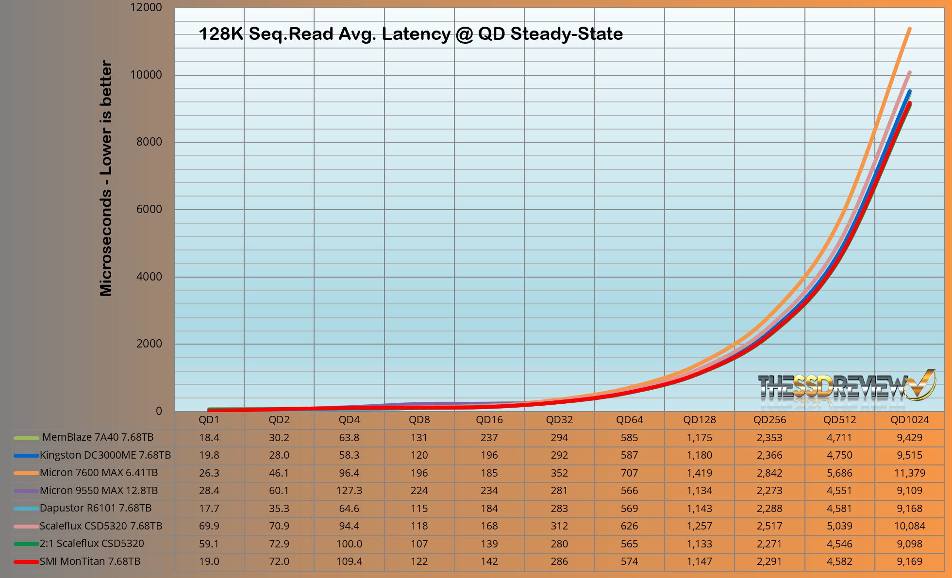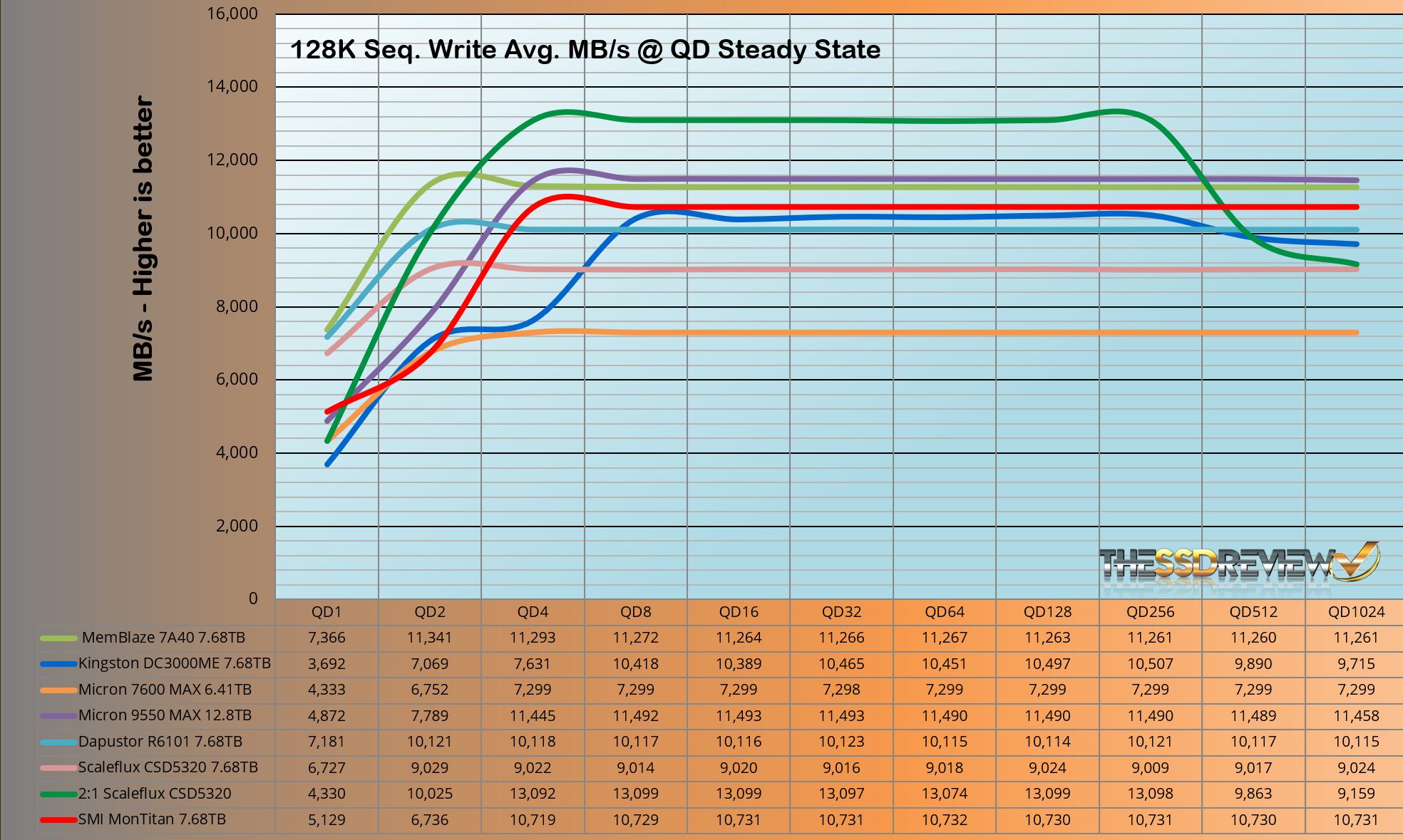 The SMI MonTitan has a listed 9.4GB/s write throughput which is shown to actually reach 10.7GB/s in our testing. Great start!