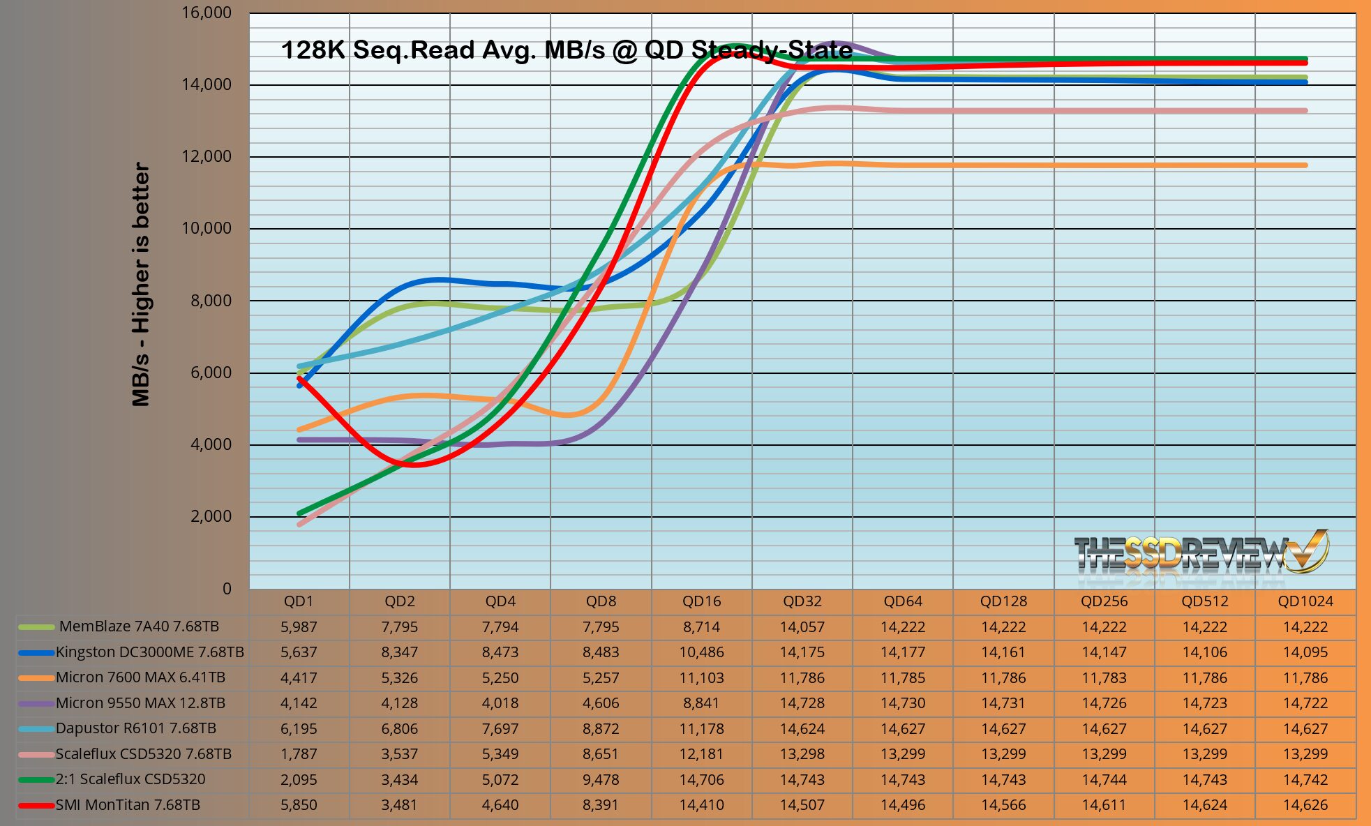 We precondition our enterprise SSDs using 100% sequential 128K writes at QD256 using one thread for two drive fills. Performance data is recorded every second. We track this data to monitor the enterprise SSDs transition to steady-state and to verify that steady-state conditions are achieved before initiating queue depth testing. Steady-state is established after a full drive fill.