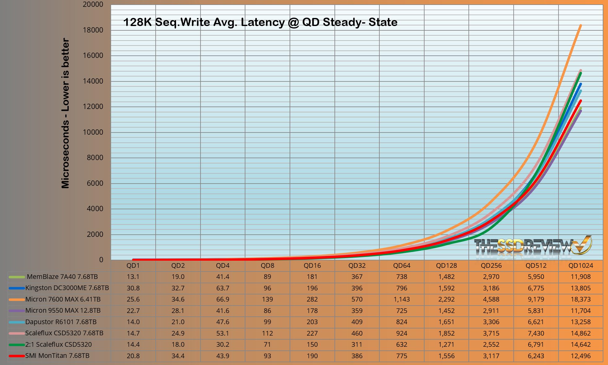 The average steady-state 128K sequential write performance is approximately 10.7GB/s from QD8 to QD1024.