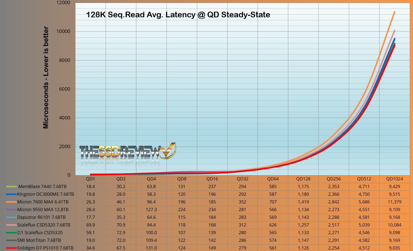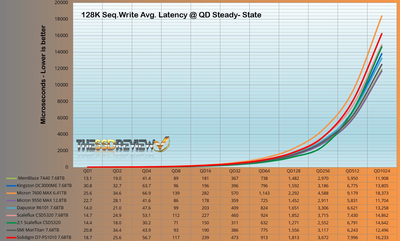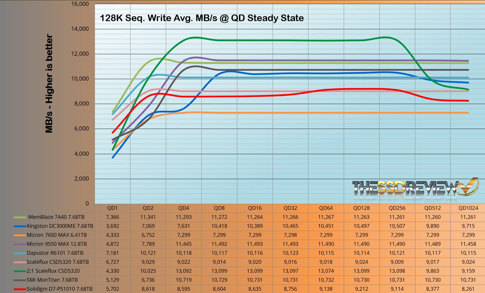 Listed specification for the Solidigm D7-PS1010 Gen5 7.8TB E1.s SSD is 10GB/s. 128K sequential write throughput and our testing provided an average of 9GB/s.