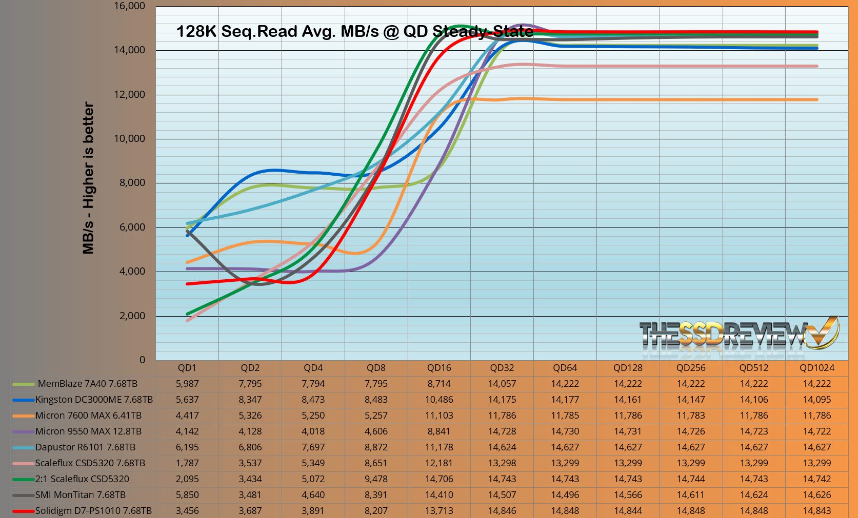 Our 128K sequential read performance test resulted in an average 14.8GB/s read throughput, whereas the listed specification was 14.5GB/s. Full performance is achieved at QD32 where the performance results in a perfectly flat line until the test was complete. This is very nice to see with 14.1GB/s being the dead on speed through QDs 32, 64, 128, 256, 512 and 1024.