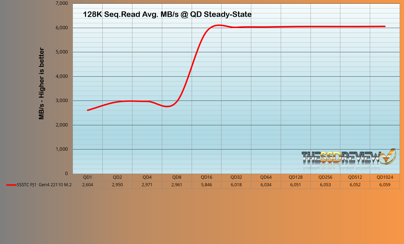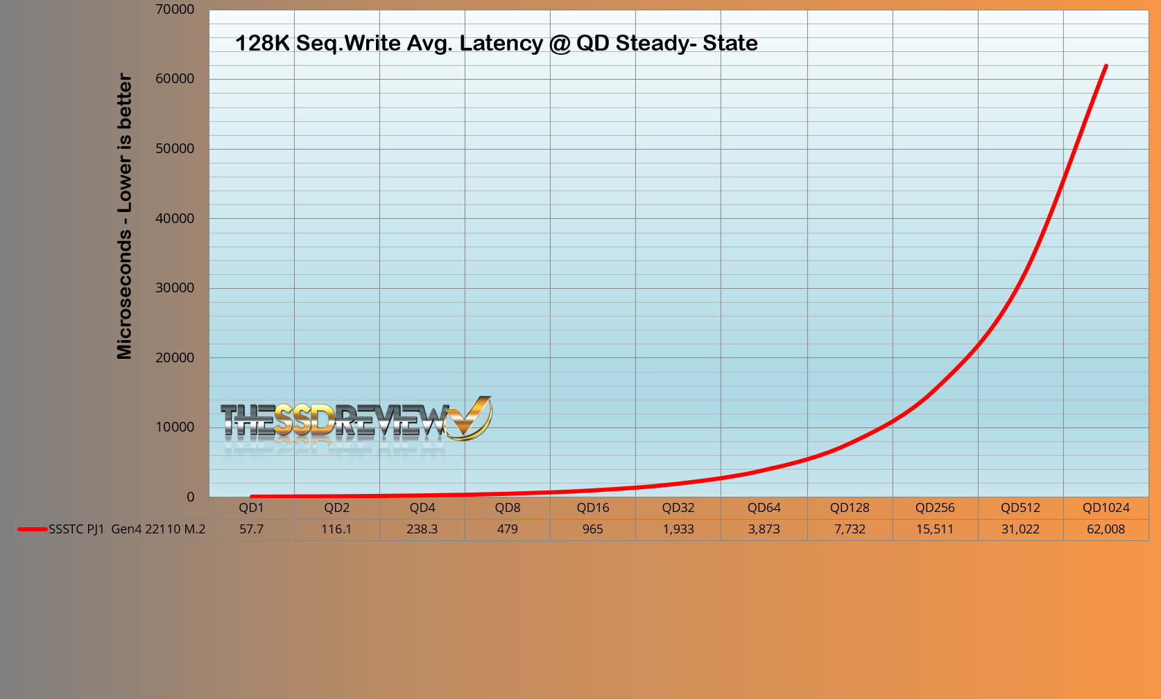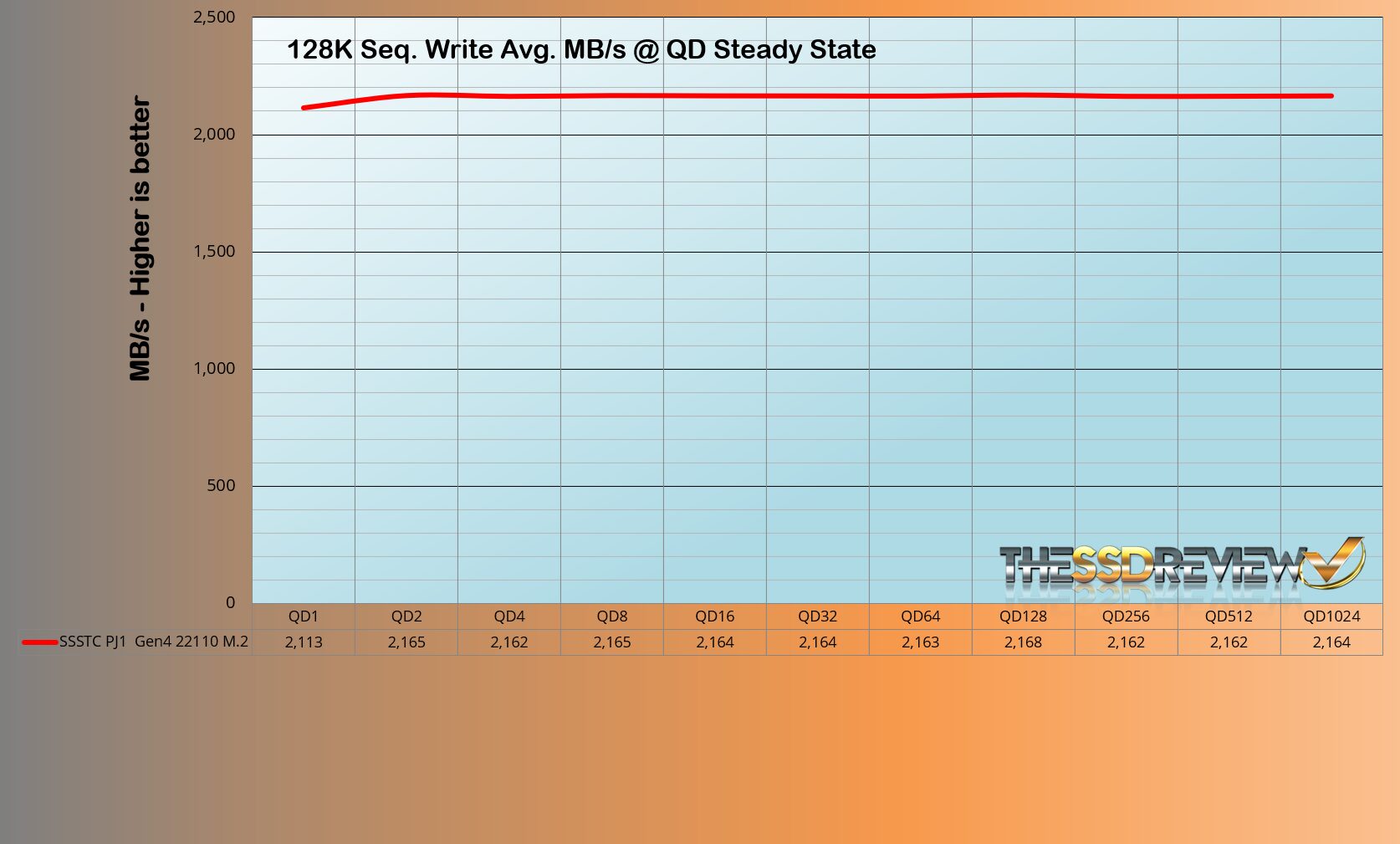 Listed specification for the SSSTC PJ1 Series Gen4 SSD is 2GB/s 128K sequential write throughput and our testing provided an average of 2.1GB/s.