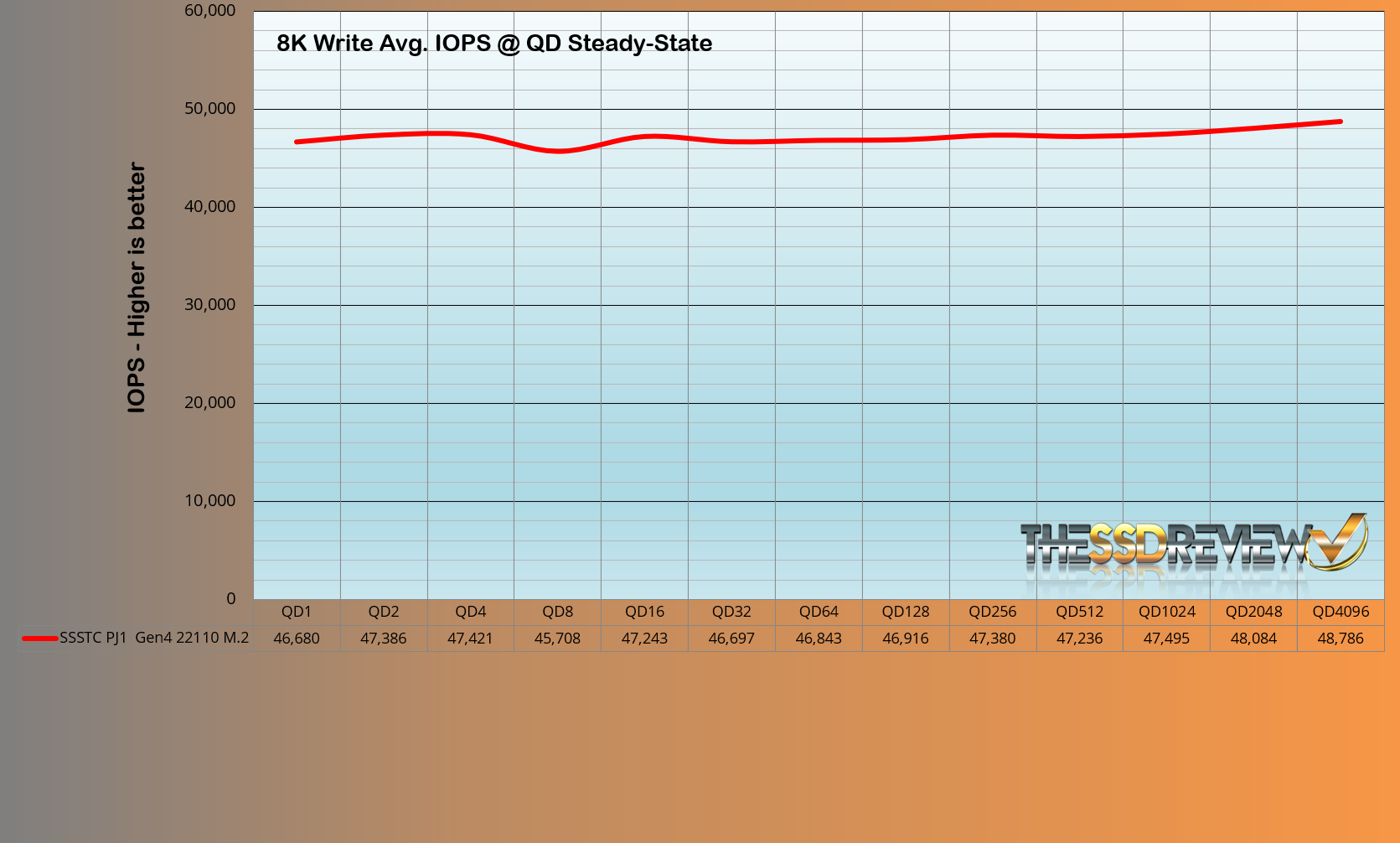 Steady-state is established after a full drive fill and the average steady-state 8K random write performance is approximately 47K IOPS.