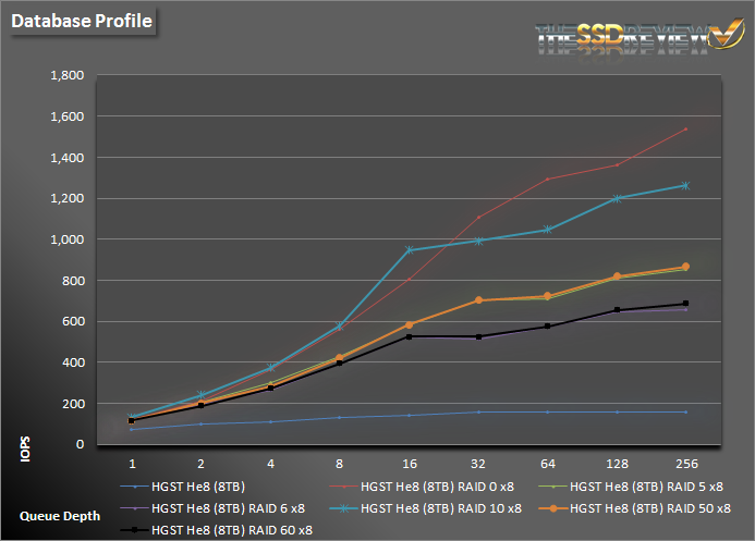 Finally, taking a look at our now industry standard workloads we can see how well it performs here. As a single drive performance peaks at around 160 IOPS. RAID 0 and 10 battle it out for best performance with RAID 10 delivering higher IOPS in three of the four workloads. Database, email server and file server performance shows similar to what we have seen already in our random and sequential tests. During the web server workload we can see that RAID 10 performance excels overall delivering 1,450 IOPS at QD 256. Impressive performance overall.