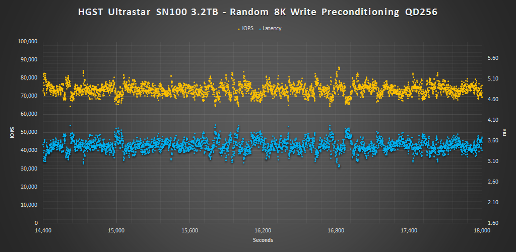 8KB preconditioning follows a similar trend to that of our 4KB precondition results. IOPS range about 15K from least to most and average around 75K. Latency during 8KB write at QD256 ranges about 0.80ms and averages at around 3.50ms.