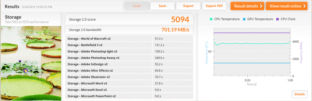 The SSD Review uses PCMark 8’s Storage test suite to create testing scenarios that might be used in the typical user experience. With 10 traces recorded from Adobe Creative Suite, Microsoft Office and a selection of popular games, it covers some of the most popular light to heavy workloads. Unlike synthetic storage tests, the PCMark 8 Storage benchmark highlights real-world performance differences between storage devices. After an initial break-in cycle and three rounds of the testing, we are given a file score and bandwidth amount. The higher the score/bandwidth, the better the drive performs.