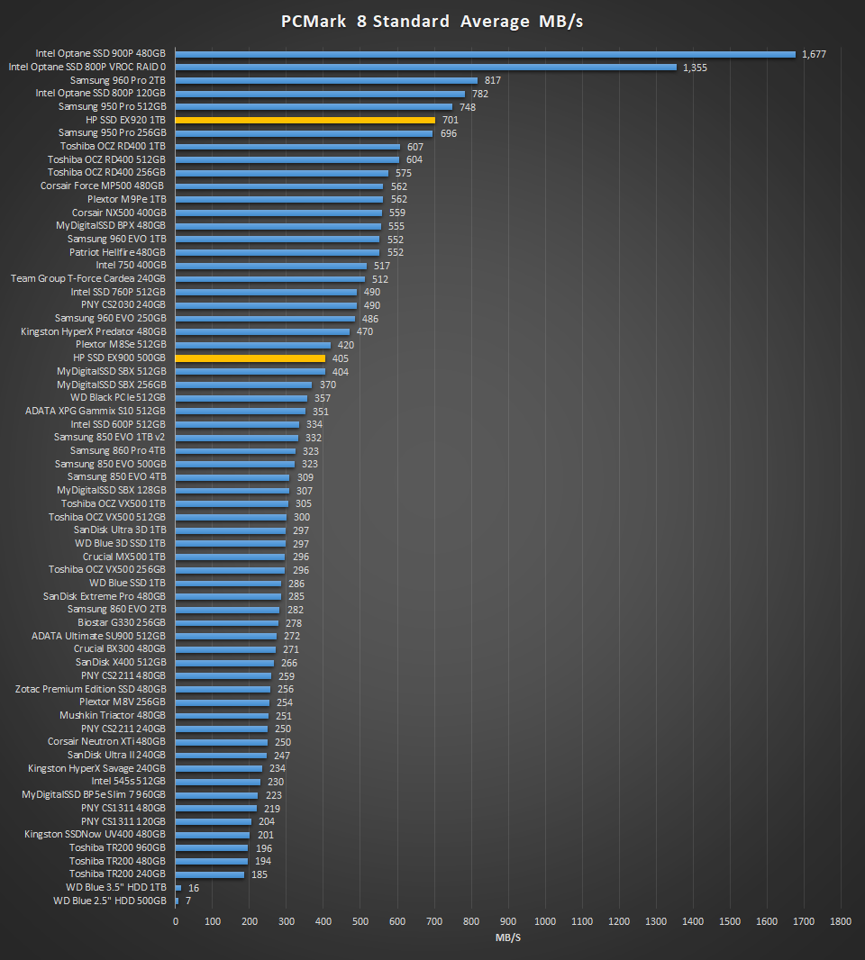 We never expected this result from PCMark 8 Storage 2.0 and, as we can see below, 701MB/s is one of the higher bandwidth speeds we have had to date, given exception to the Intel Optane and Samsung Pro series. This is definitely the highest result from an SSD with 3D TLC memory and is a bit unexpected considering our next PCMark 8 Extended Storage test may show a different end of the spectrum.