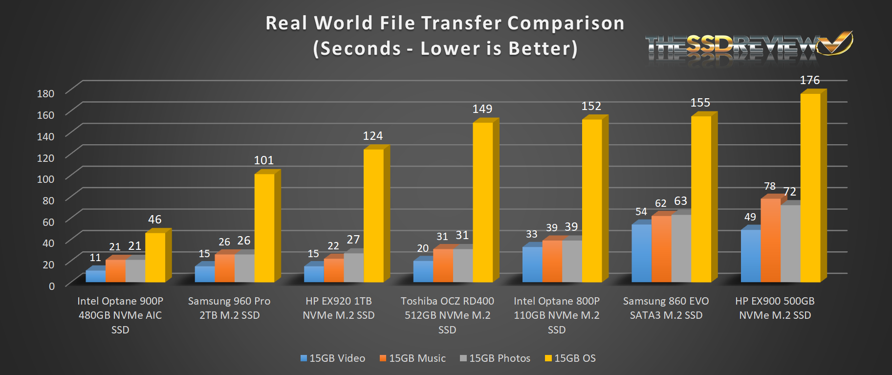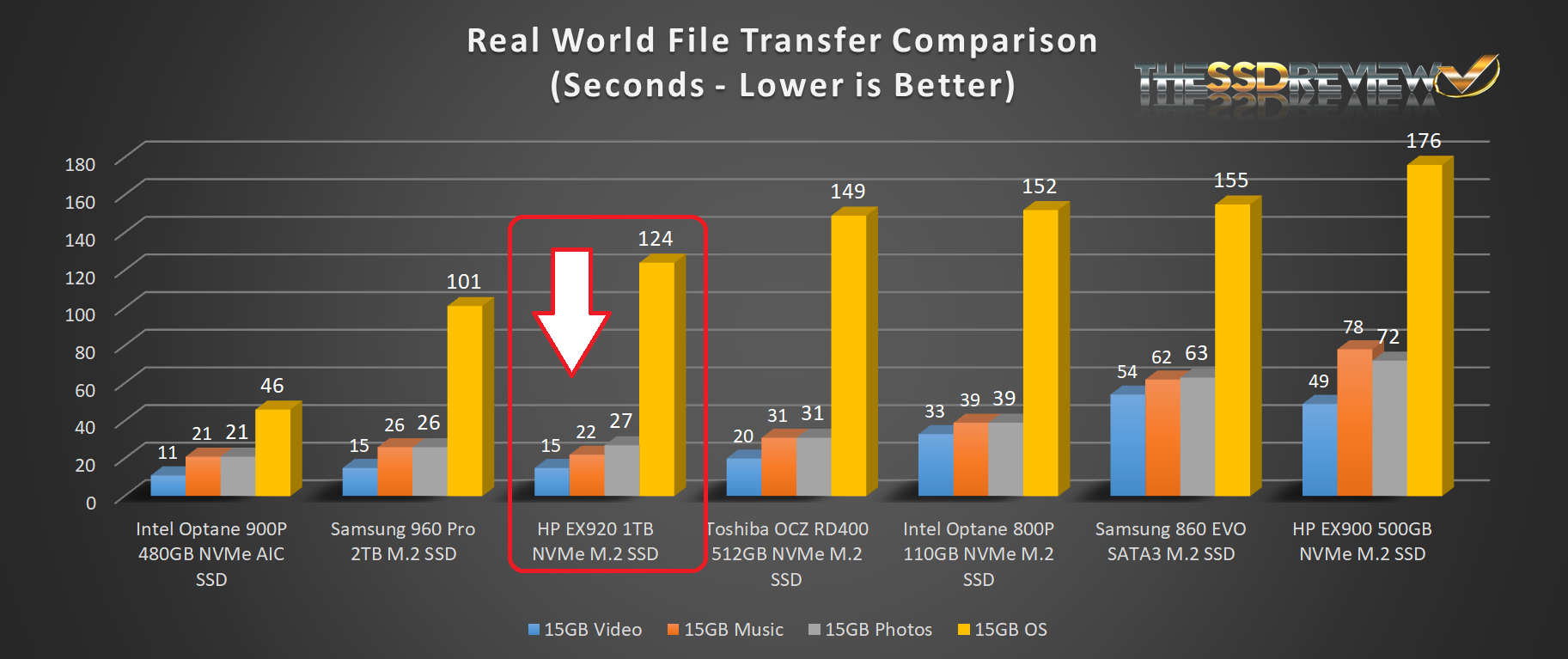 For our Real World File Transfer Comparison, we have included the Intel Optane 900P, Samsung 960 Pro, Toshiba OCZ RD400, Intel Optane 800P, Samsung 860 EVO and the HP EX900 NVMe SSD in our testing with the HP EX920 1TB NVMe M.2 SSD. This test is conducted through the transfer of data from one spot on the test drive to another to give us the truest of transfer speed results for that device.
