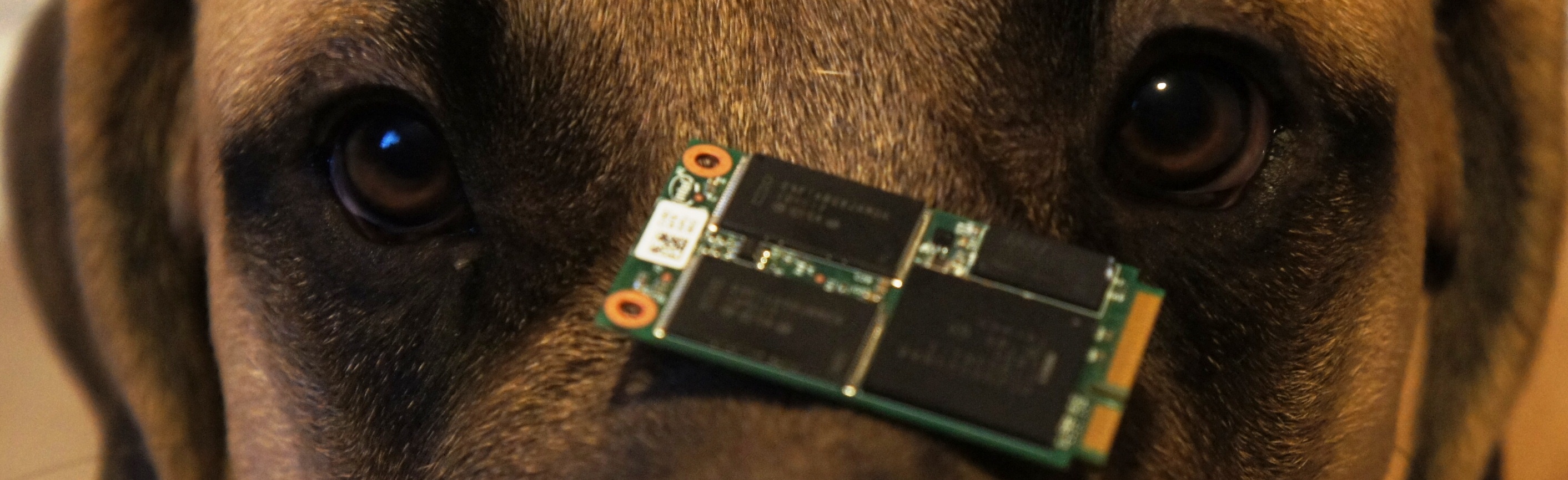 Would you believe that Diesel, one of our top security measures here at The SSD Review, weighs 12095 times more than the Intel 310 Series 80GB SSD. Here we see him hard at work guarding the unreleased Intel SSD.