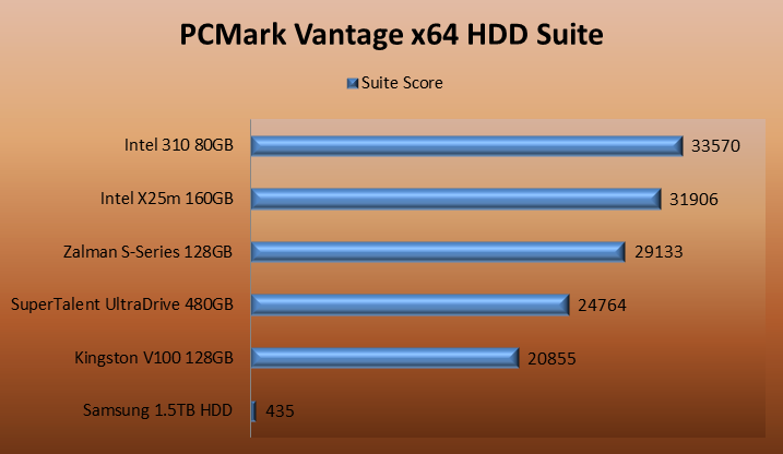 Surprisingly, the PCMark Vantage HDD Suite score of the Intel 310 Series 80GB SSD fared higher than expected with 33570 points, a score that placed it above the X25m as well as several other recent releases as seen here: