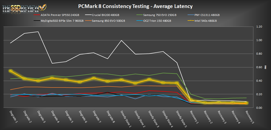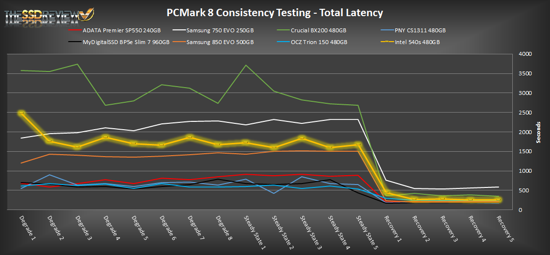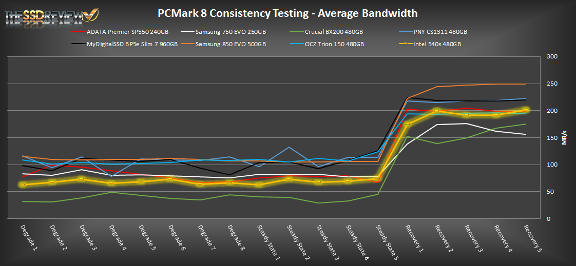 In our PCMark 8 consistency testing the Intel 540s does seem to fair well. We can see that it delivers better performance than that of the Samsung 750 EVO and Crucial BX200 and, during recovery periods, it is on par with many of the other mid-performing TLC SSDs. Overall, performance shows to be very consistent through the Degrade and Steady State phases after the first Degrade pass, but as xpected, performance jumps in the recovery section.