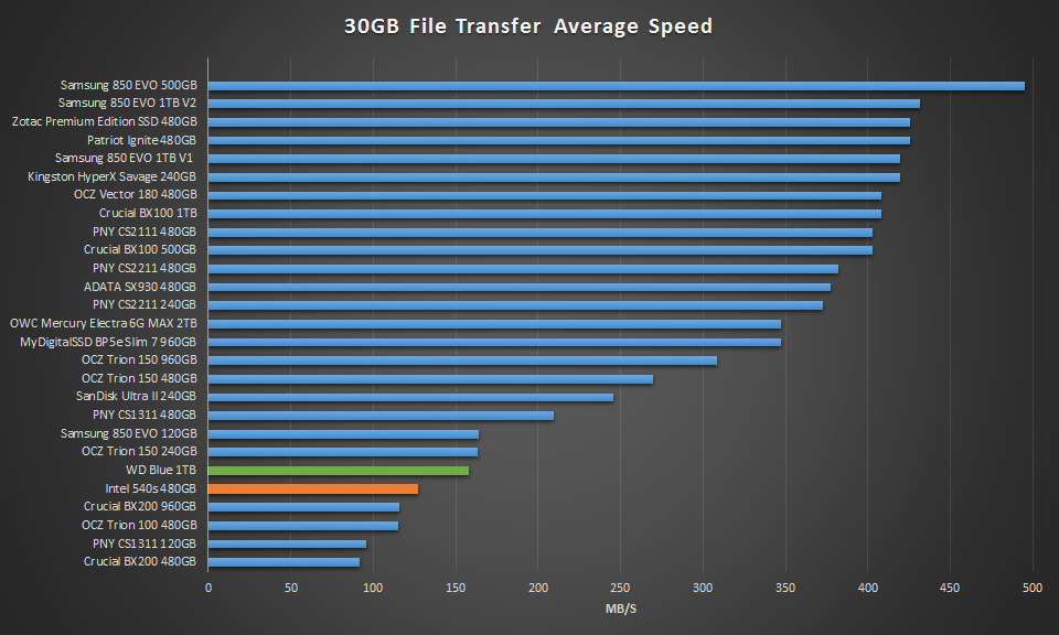 Finally, we wanted to see how performance was in a real world use when transferring large files to the SSDs. For this test we are going to simply stress write performance by transferring over a 30GB folder of movies off of one SSD to this one and time how long it takes. Once complete we can calculate the average speed.