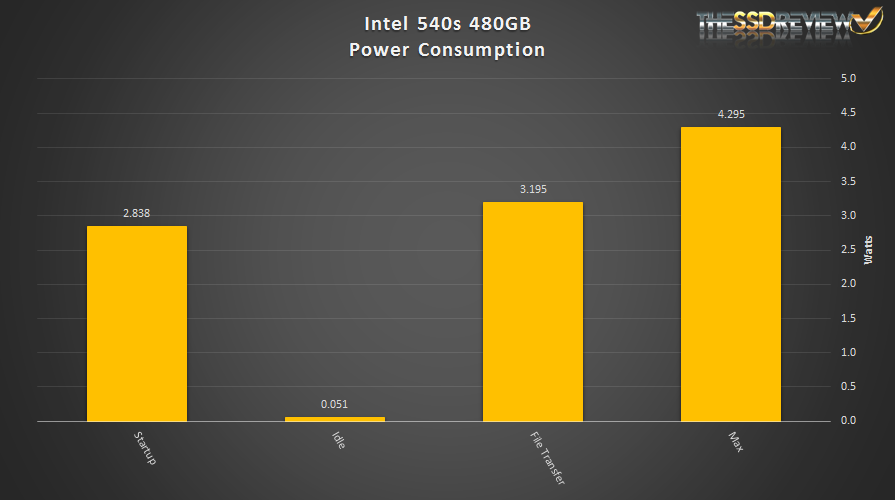 Power test results of the Intel 540s are average with similar drives in this capacity and performance bracket. The max power consumption is well regulated,maxing out at 4.3W. The File Transfer consumption was also good with a result of 3.2W.