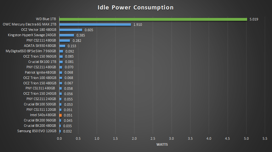 In the chart above we cn see that SSDs are magnitudes more efficient than standard HDDs. The Intel 540s shows very well controlled idle power consumption consuming only 51 milliwatts, which is spot on with the PNY CS1211 120GB model. Not too bad for a 480GB drive, even though the lower performing Crucial BX200s just beat it in this comparison.