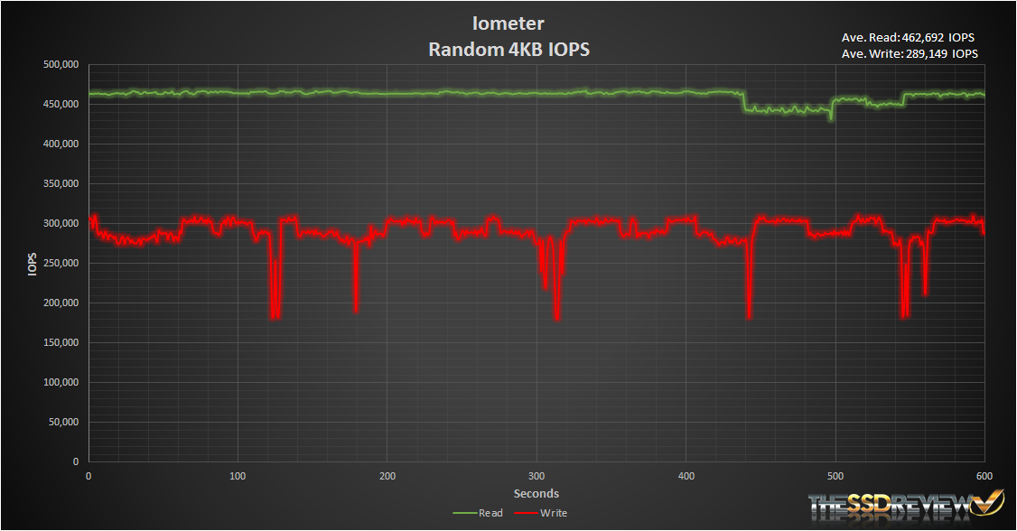 Next we ran 4K random read and write workloads for 20 minutes each and graphed the last 10 minutes above. The average read IOPS we achieved were over the rated 440K at 462,692 IOPS. Looking at the write IOPS the 1.2TB Intel 750 averaged 289,149 IOPS. Very close to the rated 290K value. We can also see that there are some dips over the 10 minute span, however, overall performance is very good as it quickly jumps back up to ~260K-300K over a few seconds. This type of performance is definitively far above that of typical consumer workloads and even that of most prosumer workloads.