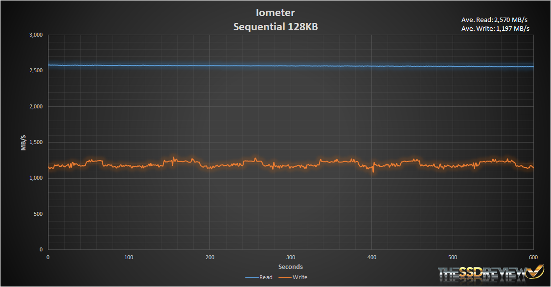 In Iometer we first preconditioned the SSD with sequential writes for 1hr. After that we recorded the speeds for an additional 20 minutes, then graphed the last 10 minutes above. As you can see, the performance is quite impressive. The Intel 750 reached an average of 2,570MB/s read and 1,197MB/s write! Looking at the consistency across the time span we can see that it is fairly consistency and offers writes ranging from 1.1GB/s minimum to 1.3GB/s max.