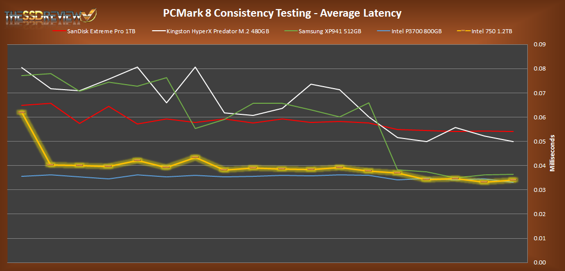 Our PCMark 8 results gave us a bit of mixed results. First, we are seeing much better performance than your average SSD with the ones above. These SSDs being compared are some of the best out and performance from these SSDs surpass typical mainstream products. Looking at bandwidth the 1.2TB Intel 750 was able to stay above the rest of the competition, however, its performance averages still remained shackled down to 350-400MB/s, not well above it as we were hoping to see. Moving onto latency we can see that compared to the SanDisk Extreme and Kingston HyperX Predator which both utilize a SATA host controller interface via AHCI, the Intel NVMe drives latency is around half. The Samsung XP941, however, gives it a good run for its money here. Overall, its consistency is very good, almost to the degree of its DC P3700 brother.