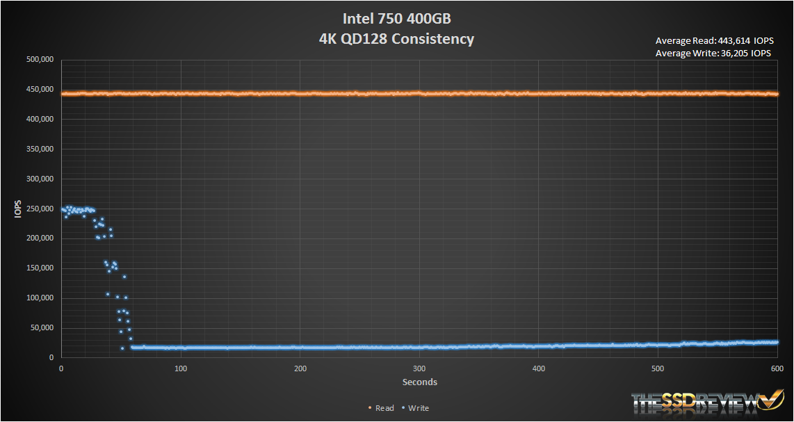In order to attain the max IOPS we set 4KB random read and write workloads at a QD of 128 and tested for a 10 minute span. We can see that read IOPS averaged 443K while write averaged 36K. After about 30 seconds performance dropped off from 250K down to 20-25K IOPS, which is extremely good for a consumer SSD. For comparison most other SSDs will drop to around 10K.