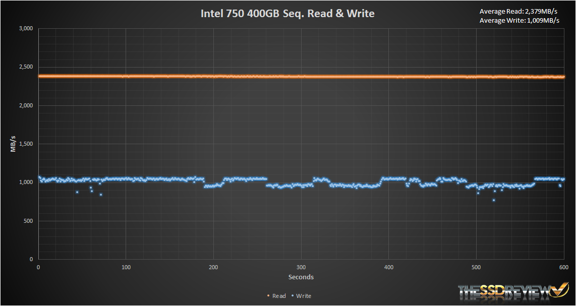 Next we measured sequential performance and got an average read of about 2.4GB/s and average write speed of 1GB/s. The consistency of both random and sequential write performance is very good.