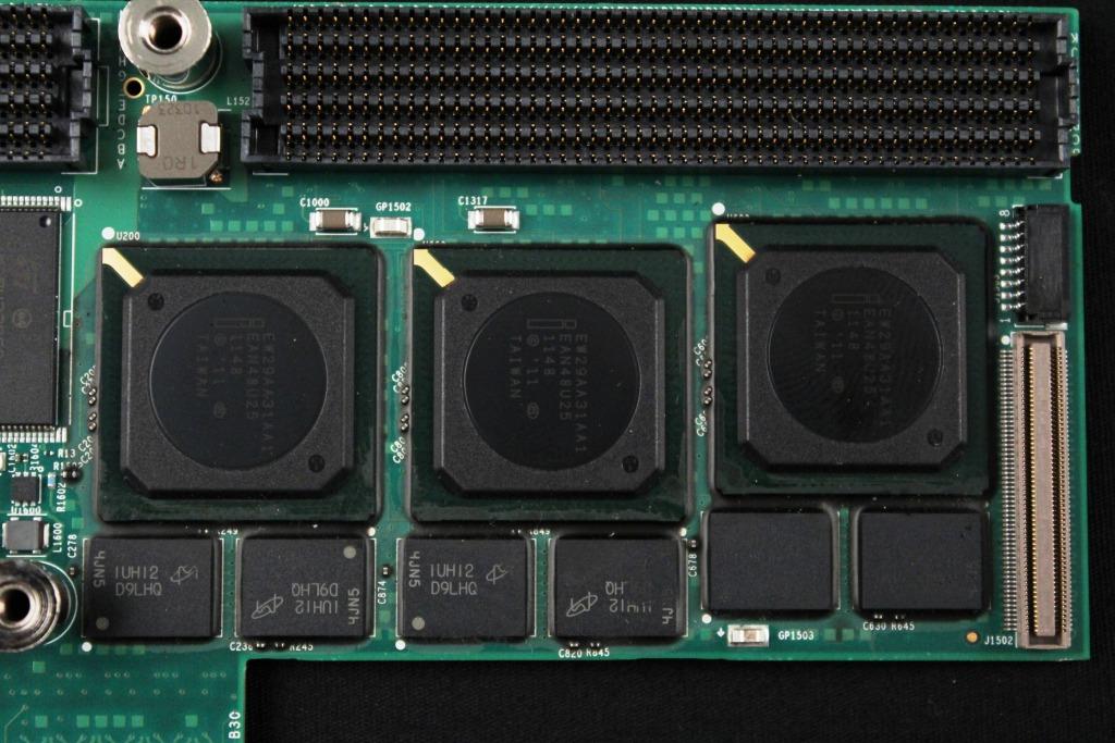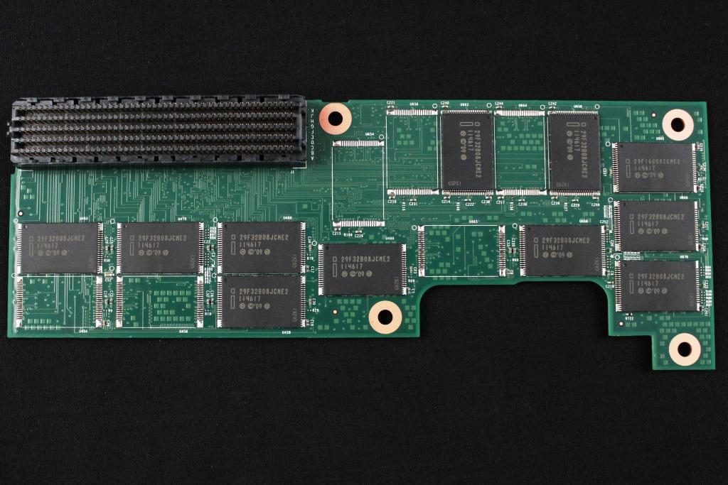 The bottom PCB is really the engine behind the whole unit. The four large black squares house the Intel/Hitachi EW29AA31AA1 processors. The large silver heatsink covers the LSISAS2008 processor. This venerable processor has been utilized in the popular 9211 series of HBAs from LSI for a few years now. This processor allows for ultra-fast latency, low driver overhead, and reliable performance.
