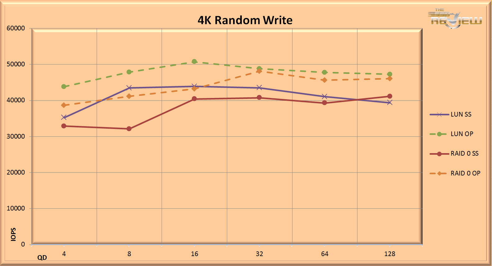 The 128K sequential results show both configurations in steady state peaking at QD32, with 170MB/s for both configurations. In particular the RAID 0 Overprovisioned results seem to be the sweet spot for the 400GB capacity device.