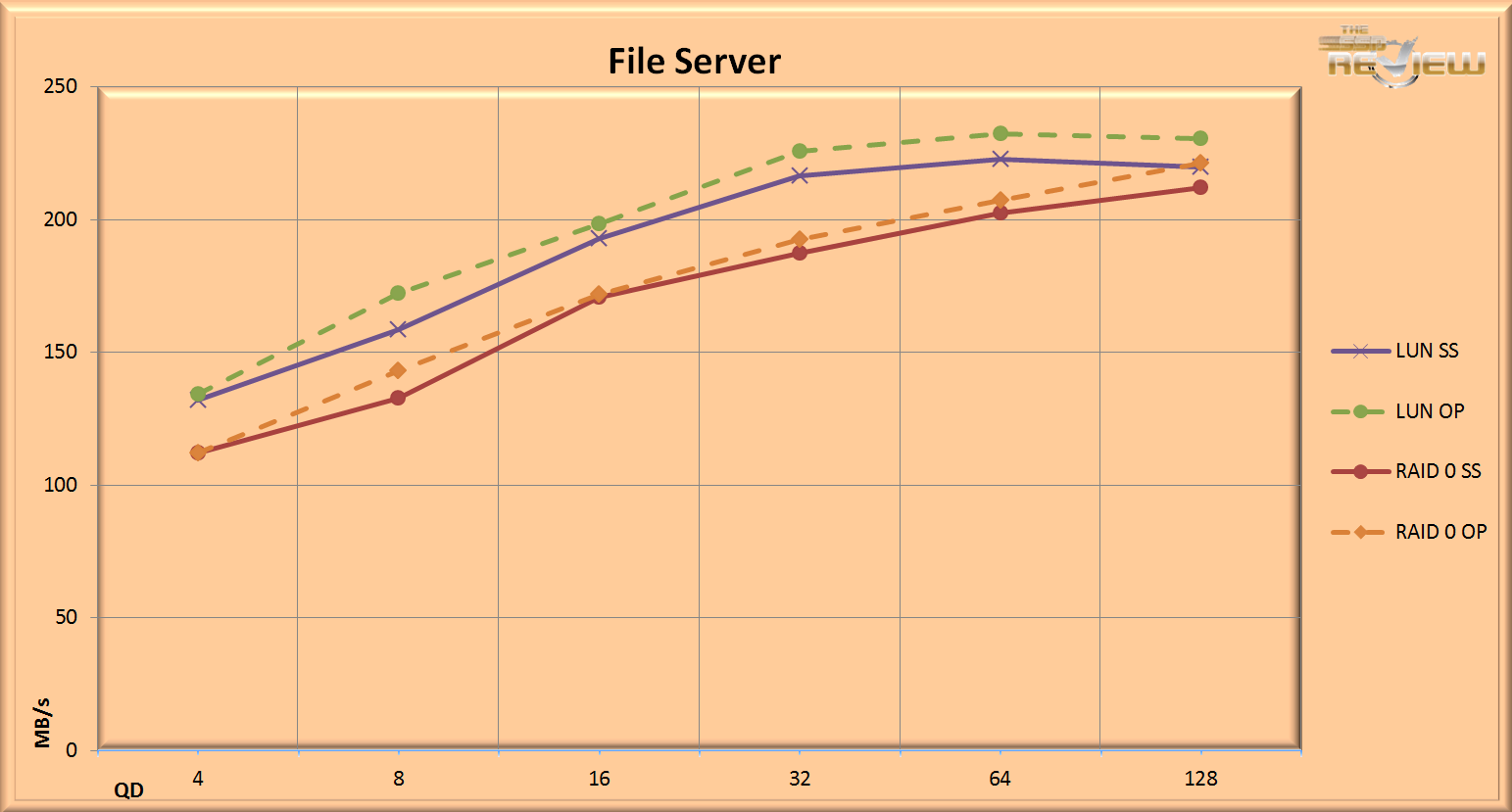 The Web Server profile is read only over a wide range of file sizes simultaneously. There is little variation in the results with this type of 100% read access. Both configurations score between 480MB/s and 500MB/s.