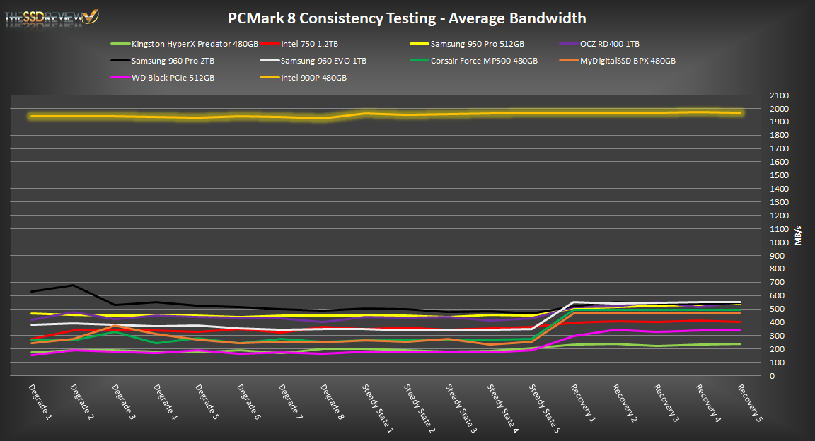 All SSDs in this chart are demonstrating steady state performance where there observed performance in this chart, is much lower than that which was advertised, except for the Intel Optane of course. Flat out, in an environment where the SSD could be put under stress of constant use, the Optane blows away the competition with just under 4 times the performance of all 9 other SSDs.