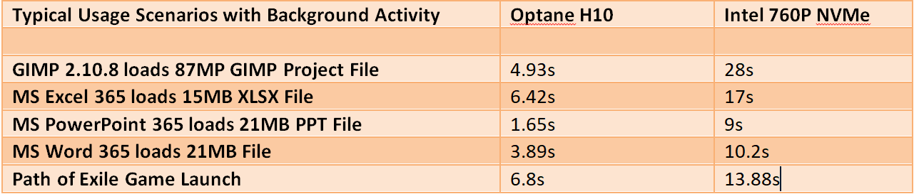 For this phase of testing, GIMP, Excel, PowerPoint, Word are started with very large files, all the while a 15GB video is being copied to another disk location in the background. As well, an instance of the Path of Exile is launched with the same background activity on its own test. In all cases, there were ten instances of each test completed with the computer restarted and remaining idle for 5 minutes between each test, the last four results being averaged for the final time. This phase of testing is suggested to demonstrate just how effective the Optane Disk Cache of the H10 is when compared to a premium SSD such as the 760P.