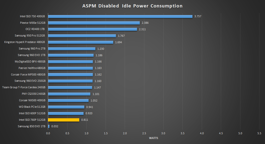 In the chart above, with ASPM enabled, we can see that the Intel 760P does in fact consume half the power at idle as the Intel 600P. But, with its result of 225mW, it is still far more than Intel’s rating of 25mW.