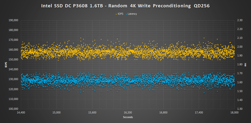 Over the course of our 4KB preconditioning in RAID 0 we can see latency consistency ranges about 0.2ms which results in about 20K IOPS distribution ranging from 150K-170K IOPS. The majority of IOPS are around 155-160K and for the most part the minimum 4KB write IOPS are above the 150K rating.