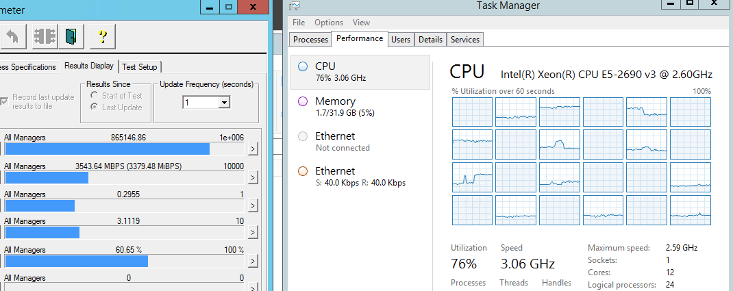 An interesting thing to note is that while reading at such high speeds our CPU usage was around 60% in Iometer and 76% overall in Windows task manager with our Intel Xeon E5-2690 v3 CPU. A single drive is actually capable of almost full utilization of our 12-core test bench CPU! This just goes to show that now with NVMe, the CPU can potentially become the bottleneck rather than the storage device, and when planning out deployment of equipped servers, one needs to take this into consideration.